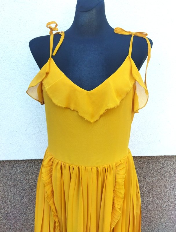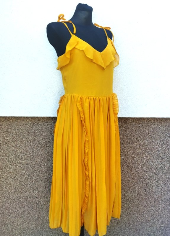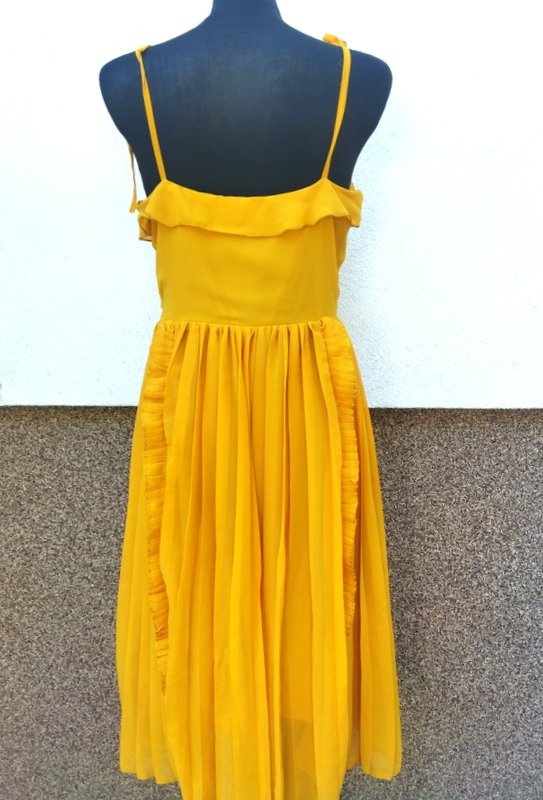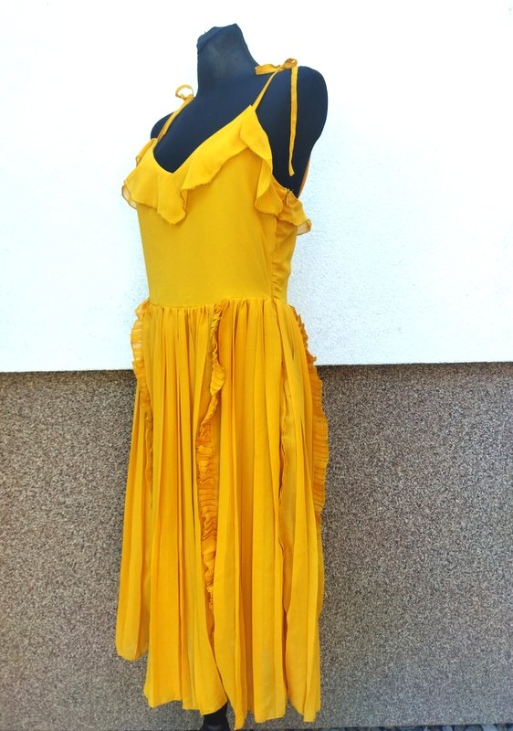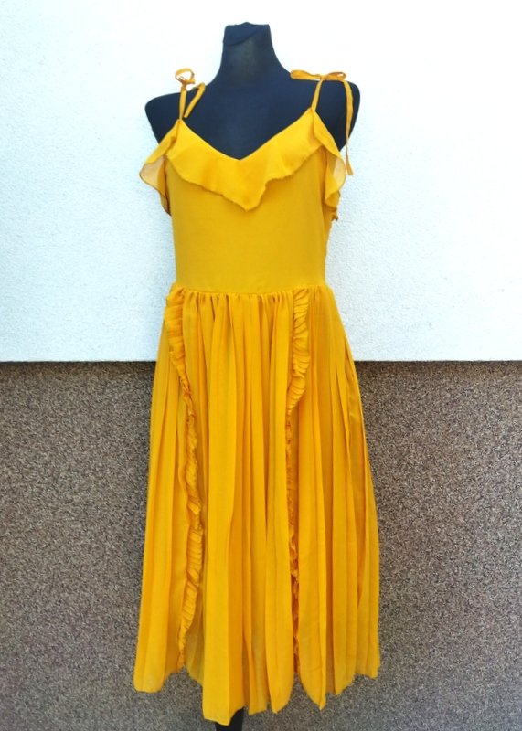 Efektowna sukienka z cienkiej żorżety w kolorze słonecznikowej żółci. Odcinana w pasie, góra na wąskich wiązanych ramiączkach, dekolt obszyty wąska falbanką , dół plisowany z pionowymi plisowanymi falbankami. Zapinana z boku na zamek. Na rozciągliwej podszewce w tym samym kolorze.