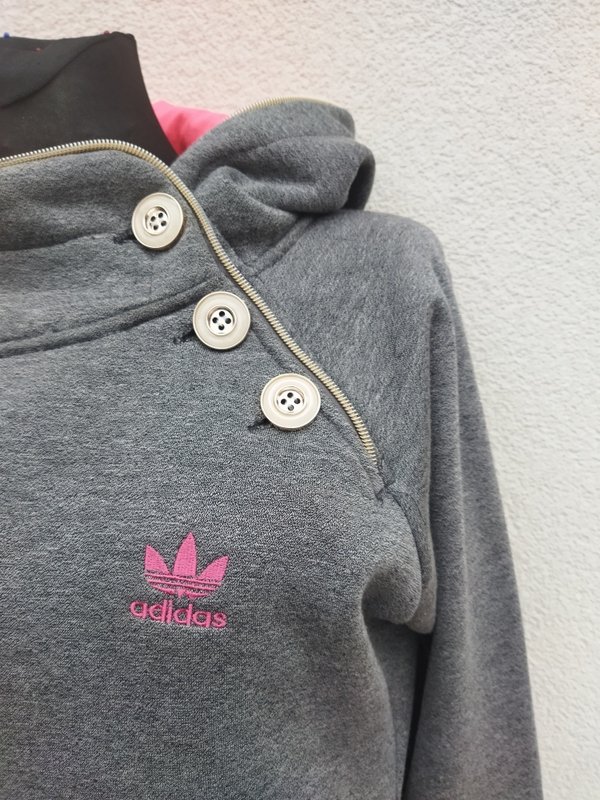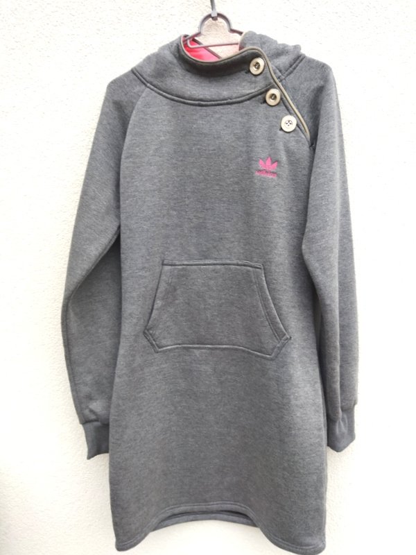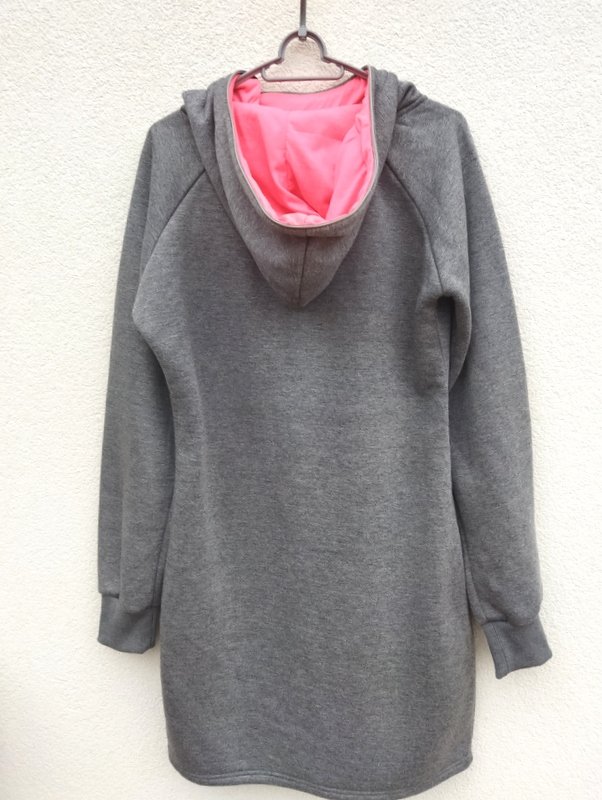 Ciepła sukienka lub długa bluza z dresowej bawełnianej tkaniny dzianinowej w melanżowym szarym kolorze. Taliowana , z raglanowymi rękawami z dzianinowymi ściągaczami , u góry z jednego boku na linii szwu rękawa zapinana na trzy ozdobne guziki. Z kapturem obszytym zamkiem, z kangurkową kieszenią z przodu . Miła i wygodna.