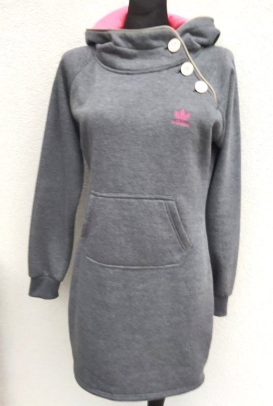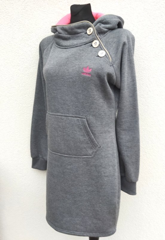 Ciepła sukienka lub długa bluza z dresowej bawełnianej tkaniny dzianinowej w melanżowym szarym kolorze. Taliowana , z raglanowymi rękawami z dzianinowymi ściągaczami , u góry z jednego boku na linii szwu rękawa zapinana na trzy ozdobne guziki. Z kapturem obszytym zamkiem, z kangurkową kieszenią z przodu . Miła i wygodna.