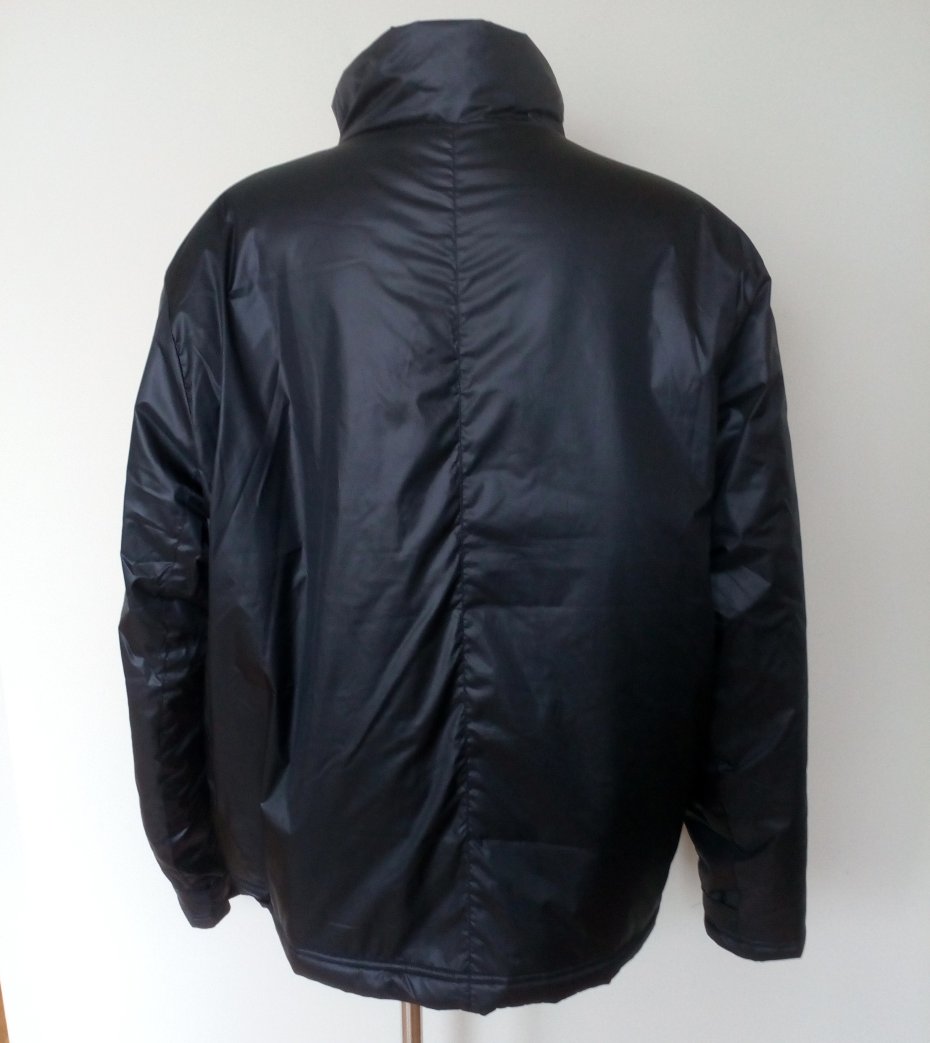 Czarna, puchowa kurtka, puch polyestrowy, paski na rękawach w zgaszonym, niebieskim kolorze, na piesi pionowa kieszeń zapinana na zamek, u dołu przodu pionowe kieszenie z zamkami, od wewnątrz jedna kieszeń również z zamkiem, biodra i dół rękawów regulowane paskami , od srodka czarna podszewka