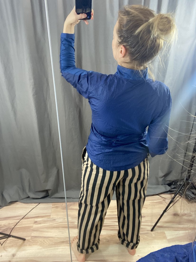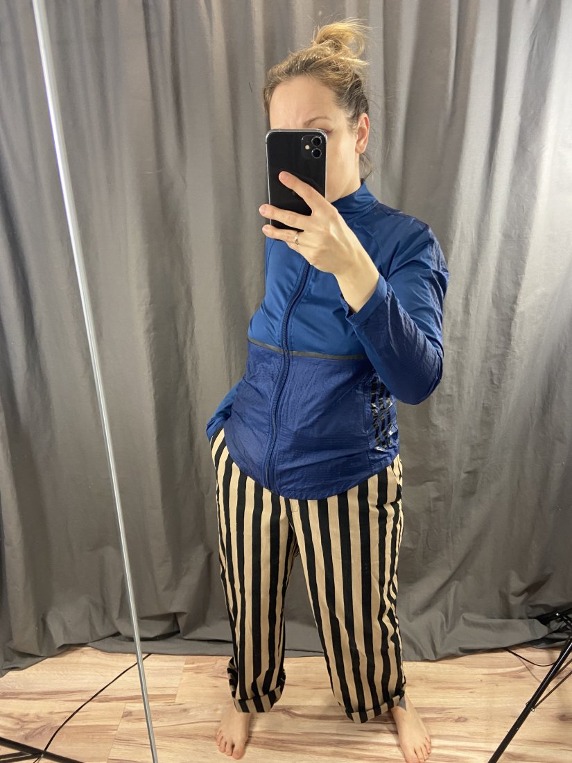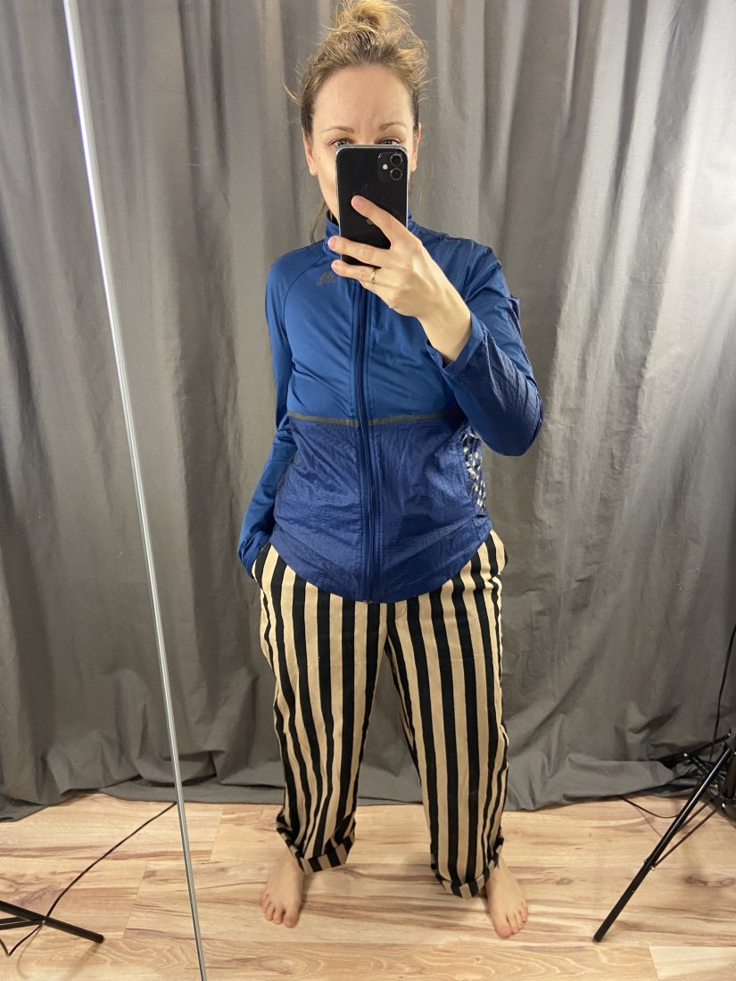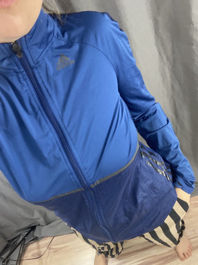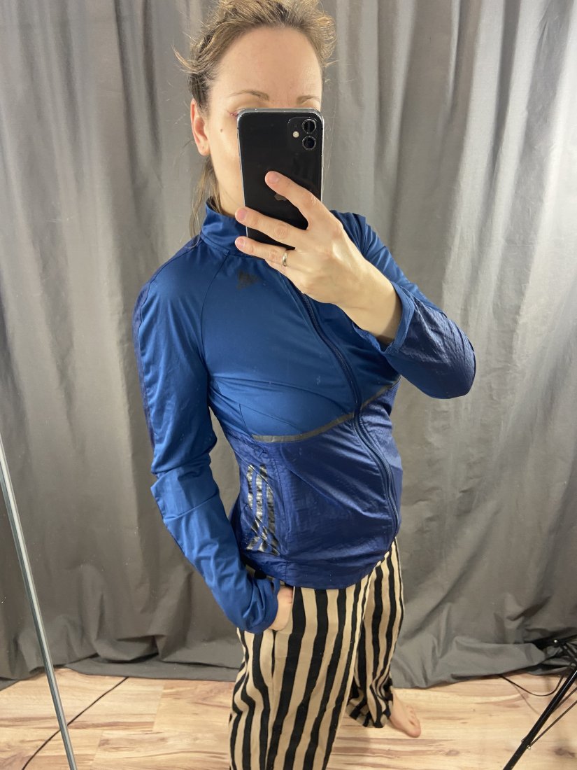 Adidas Running. Cieniutka bluza/kurtka, którą można sobie spakować w saszetkę i zabrać gdziekolwiek potrzebujemy. Zapinana na zamek, z kieszeniami w biodrach (też zapinanymi). Rękawy zakończone otworkami na kciuki.