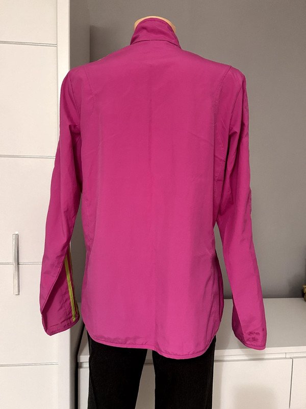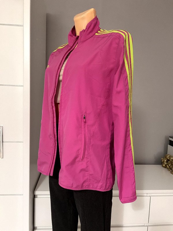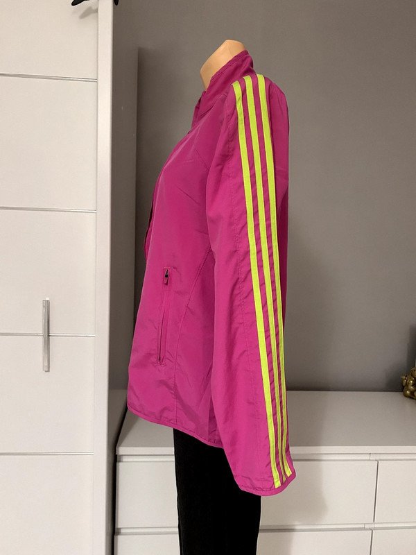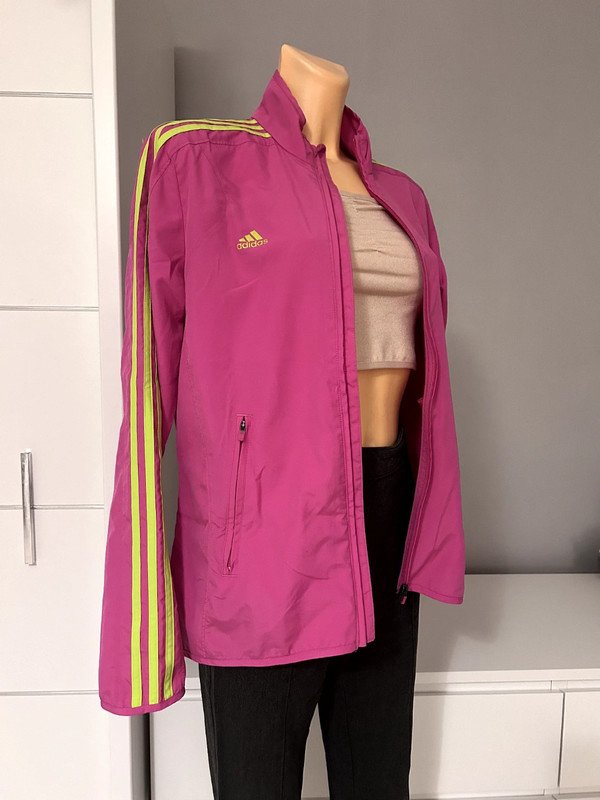 Kurtka marki Adidas, rozmiar z metki to XL 42. Posiada zamek, ma z przodu kieszenie. To wiatrówka, którą po złożeniu schowasz do torebki, bo zajmuje mało miejsca. Trzy paski na ramionach są limonkowe.