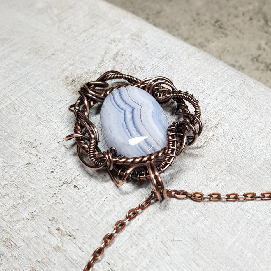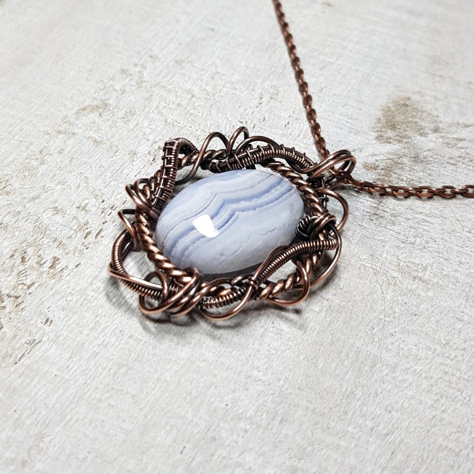 Zawieszka wykonana metodą wire-wrappingu w miedzi z naturalnym agatem koronkowym niebieskim blue lace. Wymiary wisiorka 45x35 mm, całość oksydowana i wypolerowana dla nadania szlachetnego wyglądu przyciemnienia. Do zawieszki dołączam łańcuszek długości 45-50 cm.