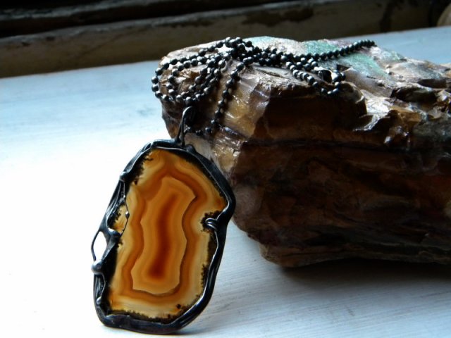 naszyjnik. agat oprawiony w ocynowaną miedz stylizowaną na stare srebro.łańcuszek z oksydowanej stali o długości 50 cm.m wisior o wymiarach 7,5cm x 4 cm
