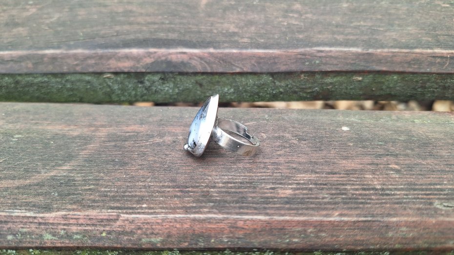 Pierścionek wykonany z miedzi, cyny i agatu dendrytowego. Wymiary ok. 2.2 na 1.8 cm. Regulowany. Nie jest ciężki.