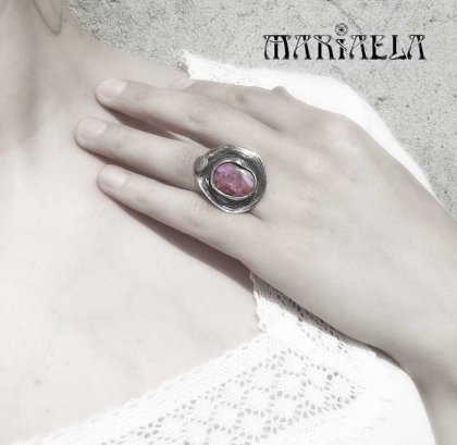 W artystycznej, cynowanej (ekologiczna, bezołowiowa cyna) ramie został osadzony fioletowy agat. Oczko pierścionka ma średnicę 2,9 cm. Konstrukcja trwała, wodoodporna. Regulowana, posrebrzana obrączka. Serdecznie zapraszam do zakupu! W rzeczywistości prezentuje się jeszcze ciekawiej!