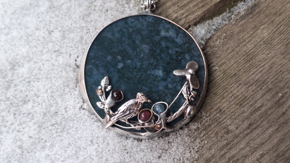 Wisiorek wykonany z miedzi, cyny, turmalinów i agatu mszystego. Wymiary ok. 5 na 5 cm. Zawieszony na łańcuszku o długości ok. 50 cm.