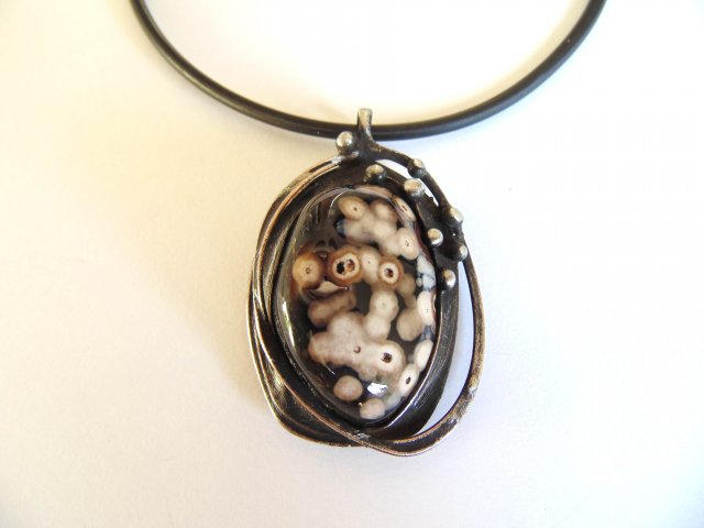 Wisiorek wykonany z miedzi, cyny i agatu. Zawieszony na czarnej lince kauczukowej o długości ok. 45 cm. Wymiary ok. 4,5 na 3,3 cm.
