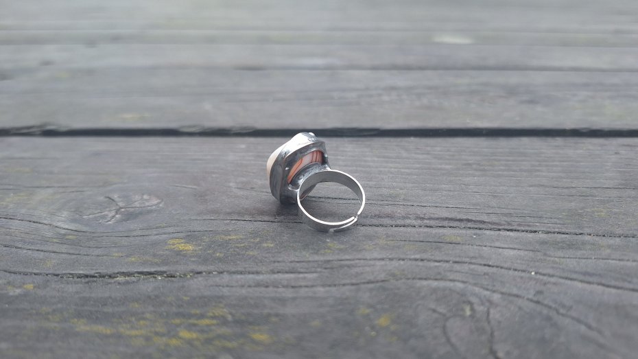 Pierścionek wykonany z miedzi, cyny i agatu. Wymiary ok. 2.4 na 1.5 cm. Regulowany. Nie jest ciężki.