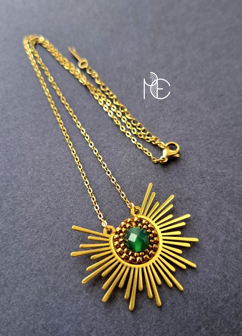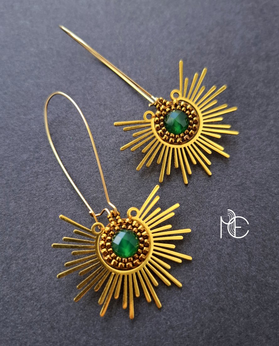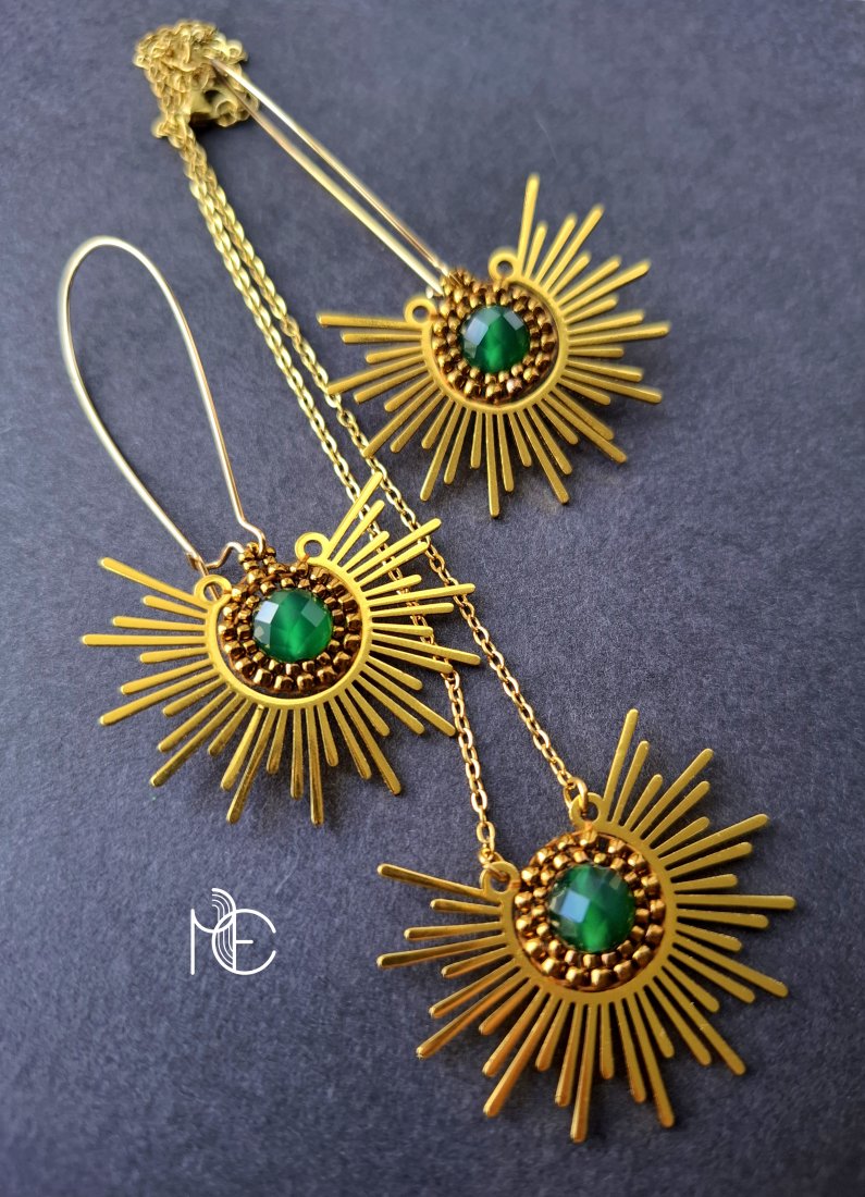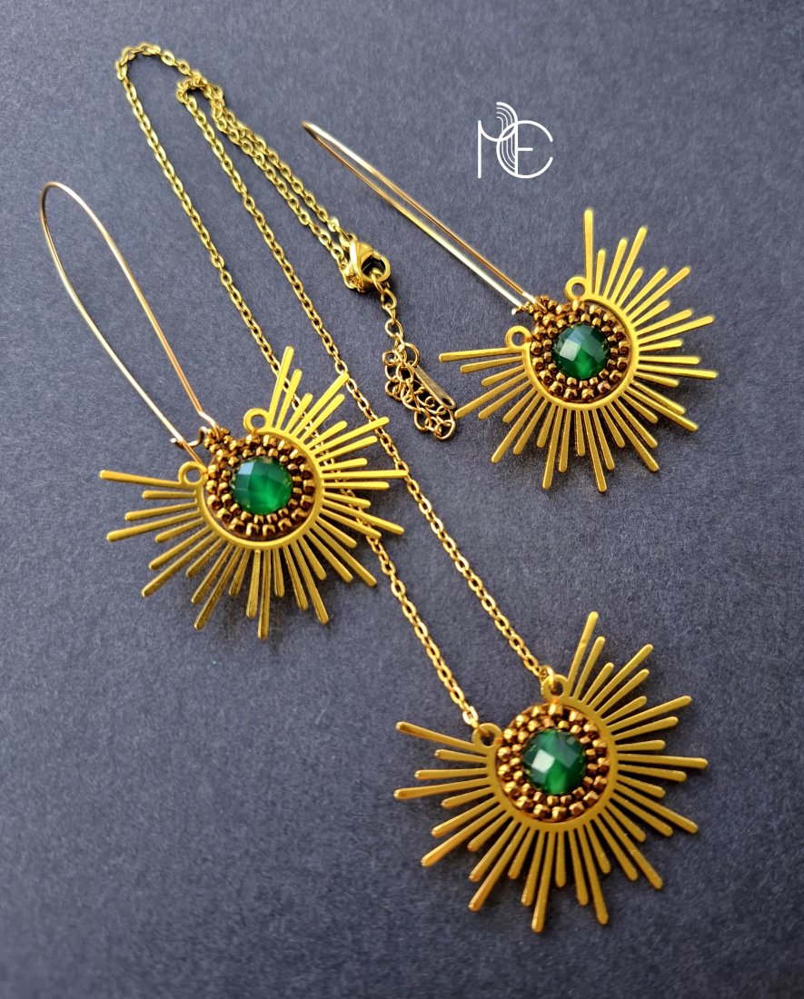 Komplet biżuterii wykonanej z połączenia stali szlachetnej, agatami brazylijskimi i koralików szklanych. Kolczyki dwustronne, podwieszone na prostych, pozłacanych i nieuczulających biglach. Naszyjnik o łańcuszku ze stali szlachetnej pozłacanej i możliwością regulacji obwodu. Wymiary kolczyków - długość wraz z zapięciem - 7,2 cm; szerokość max. 4,2 cm. Długość naszyjnika wraz z łańcuszkiem przedłużającym - 43 cm.