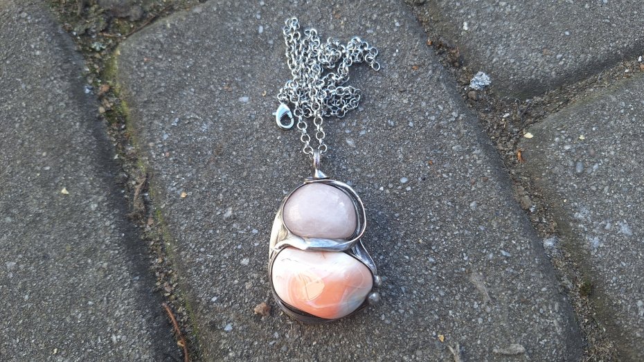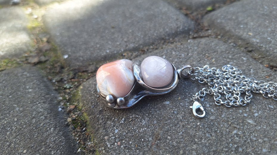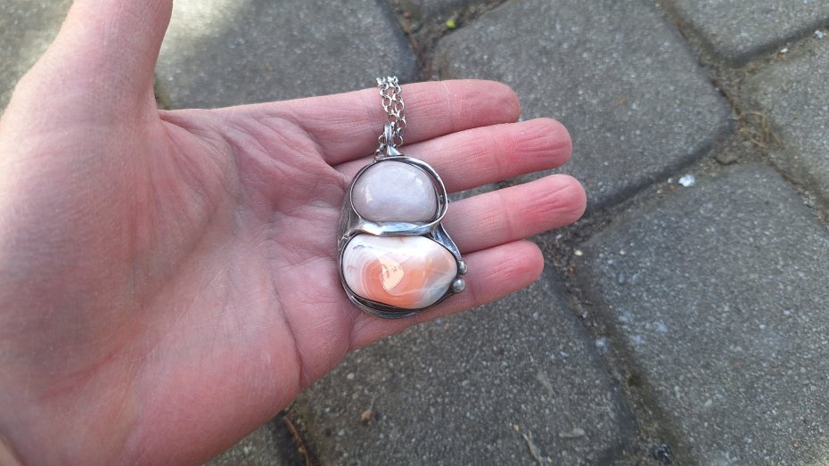 Wisiorek wykonany z miedzi, cyny, naturalnego agatu i różowego kwarcu. Wymiary ok. 4.5 na 3.5 cm. Zawieszony na łańcuszku o długości ok. 50 cm.