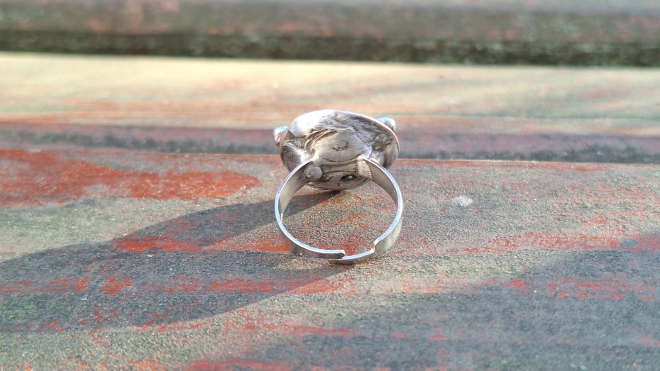 Pierścionek wykonany z miedzi, cyny i agatu. Wymiary ok. 2 na 2 cm. Regulowany. Nie jest ciężki.