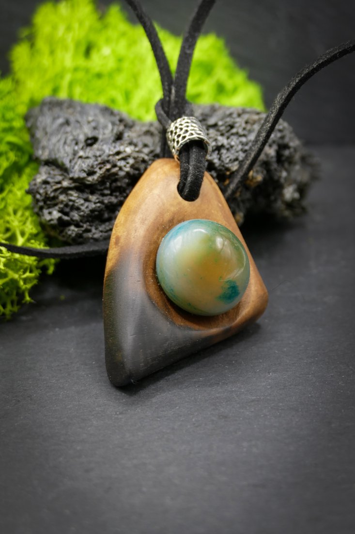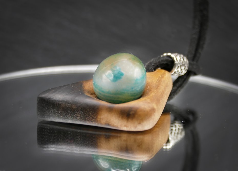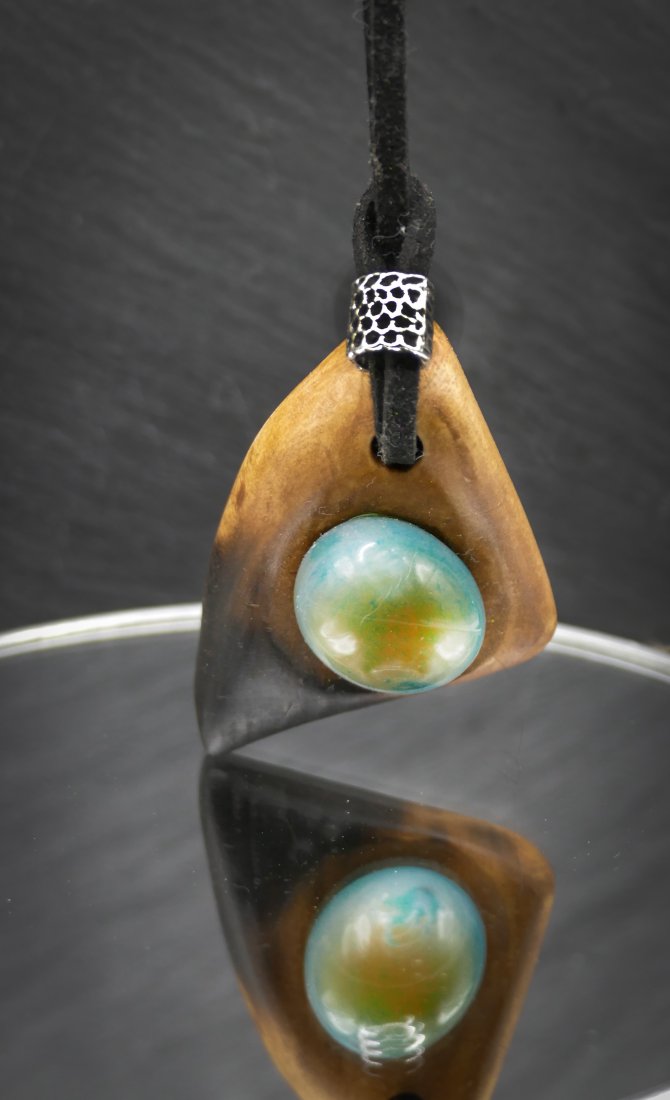 Drewno zostało bejcowane na odcień kasztanu, woskowane oraz polerowane, co nadało mu elegancką, satynową powierzchnię. Fragment biżuterii jest celowo opalany, tworząc ciekawy kontrast struktury i koloru.