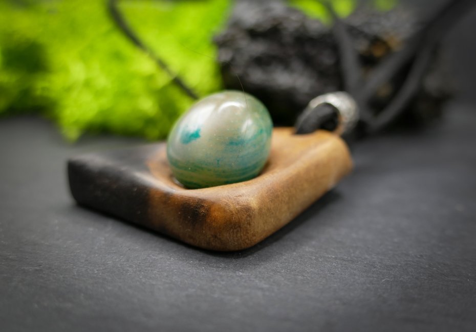 Całość zawieszona na czarnym rzemieniu (ok. 80 cm) z metalowym akcentem. Idealny dodatek dla miłośników naturalnego designu i oryginalnych form.