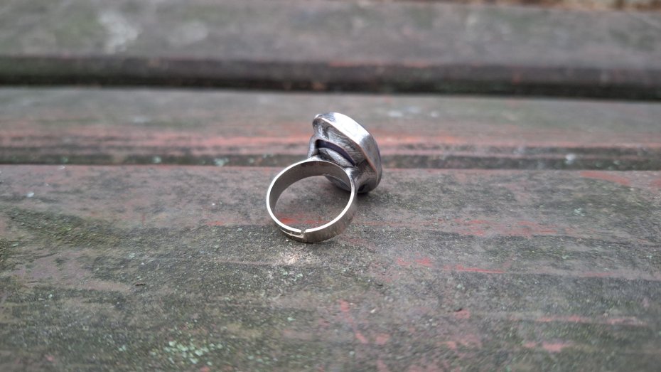 Pierścionek wykonany z miedzi, cyny i agatu. Wymiary ok. 2 na 1.5 cm. Regulowany. Nie jest ciężki.