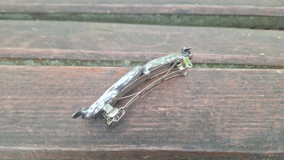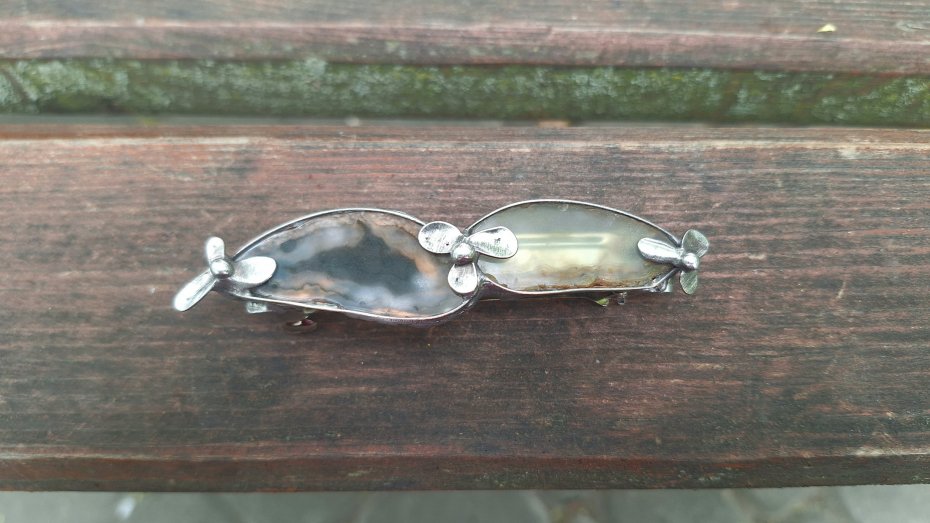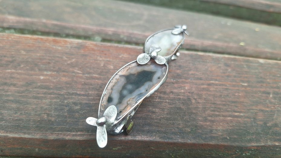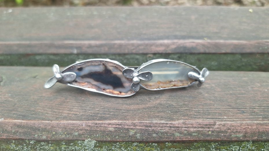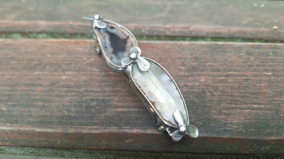 Klamra do włosów, wykonana z miedzi, cyny i agatów. Wymiary ok. 8 na 2 cm. Zapięcie 6 cm, metalowe.