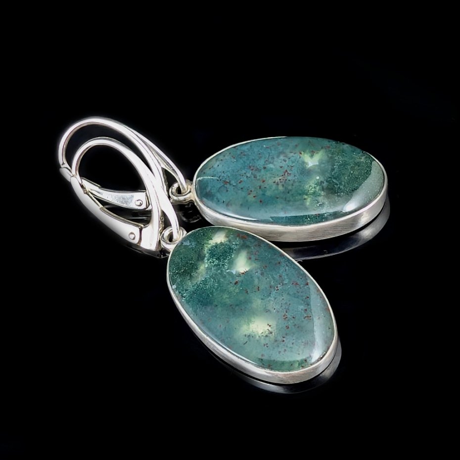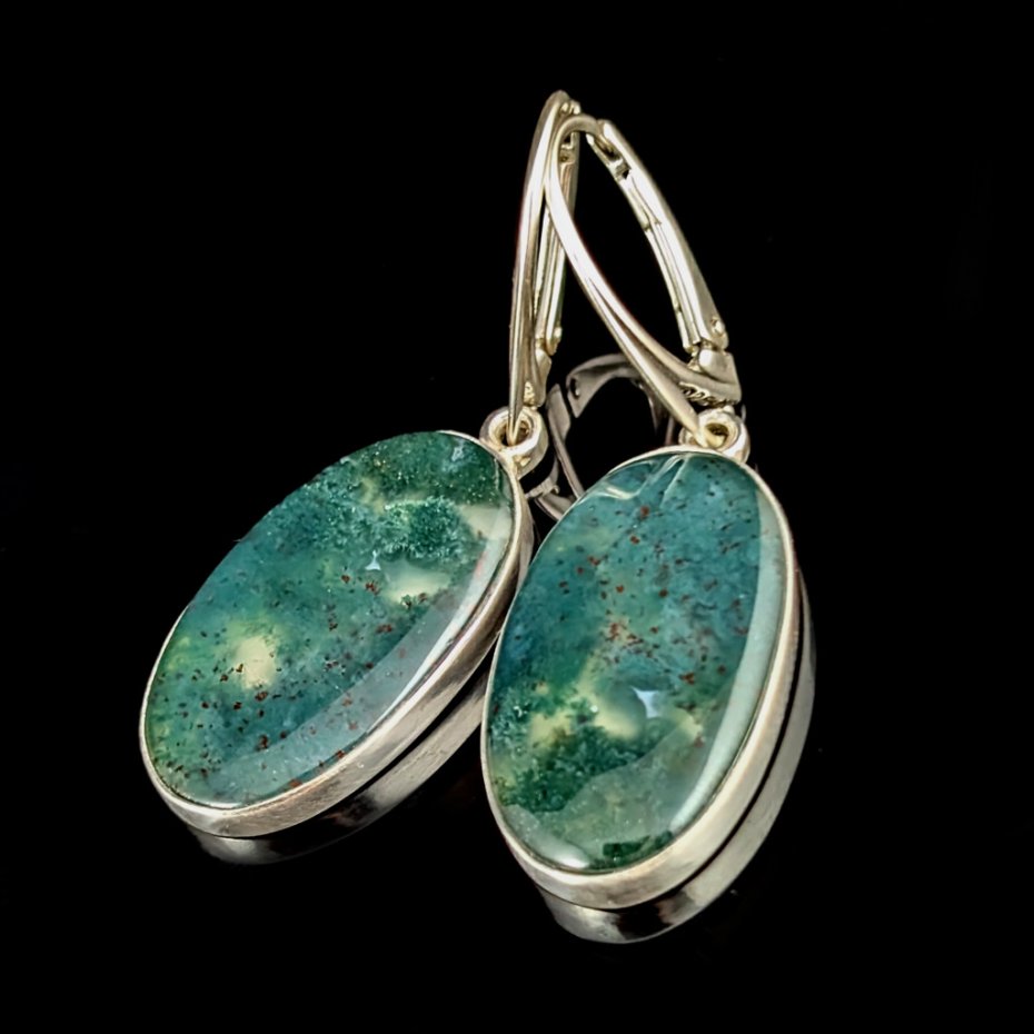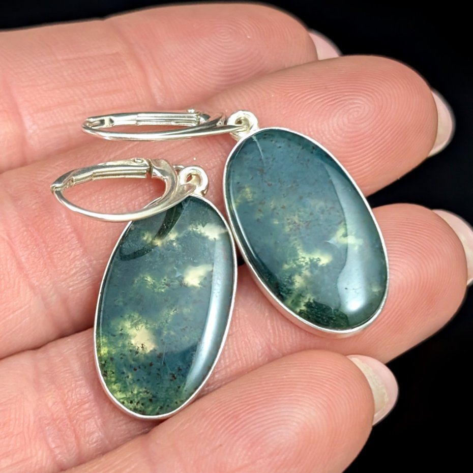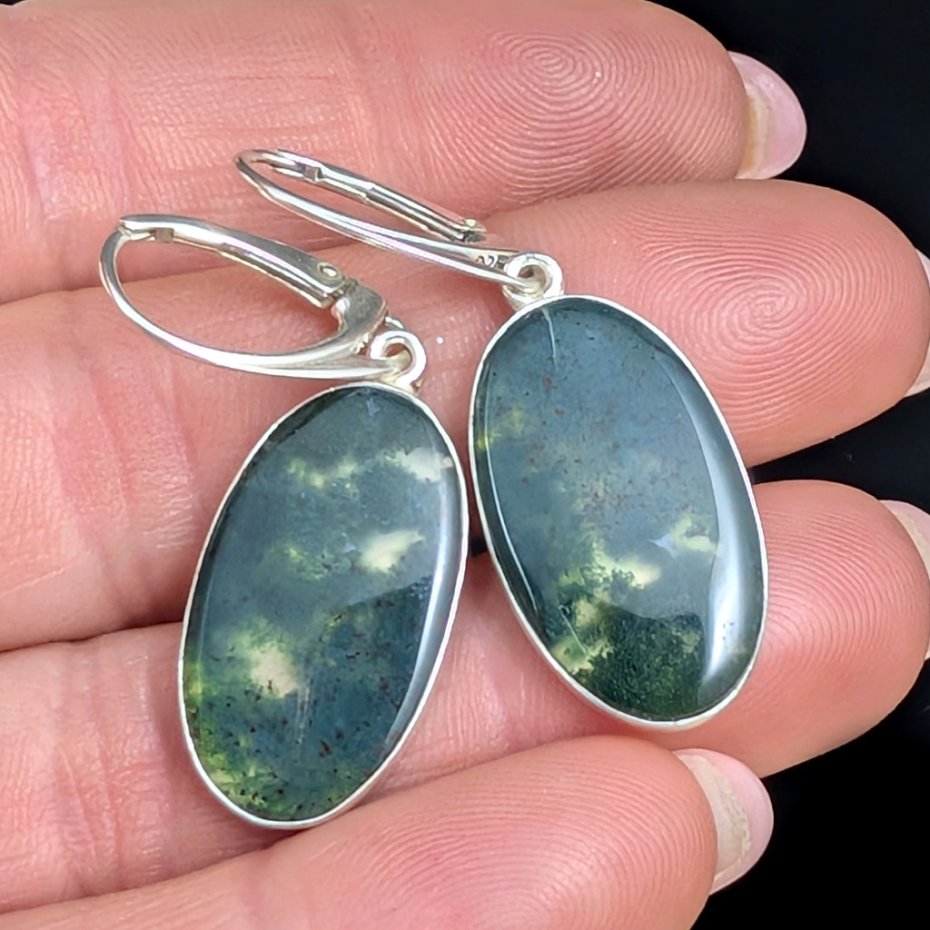 Kolczyki z oprawionymi w srebro próby 925 agatami mszystymi. Kamienie zjawiskowe, inkluzje wewnątrz wyglądają jak zaklęta roślinność. Wymiary 23 x 13 mm, długość 42mm. Waga jednego kolczyka 4,5 g. Kolczyki zostaną zapakowane w ozdobne pudełeczko.