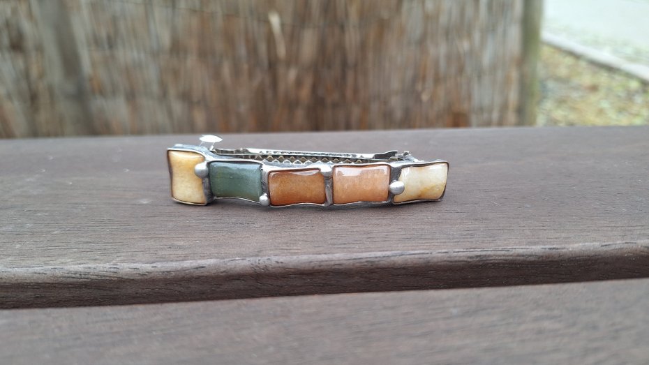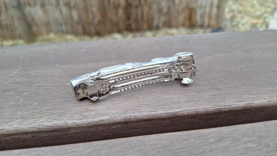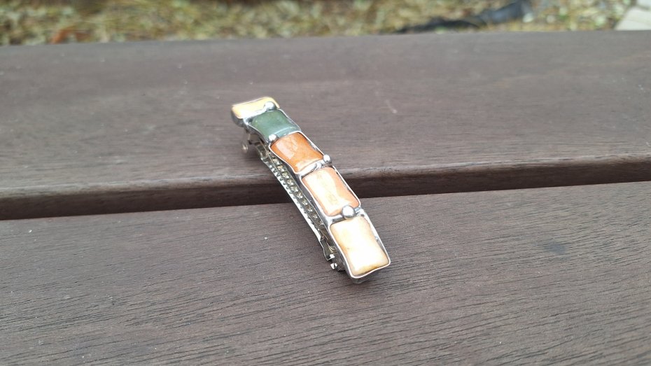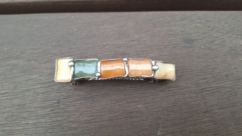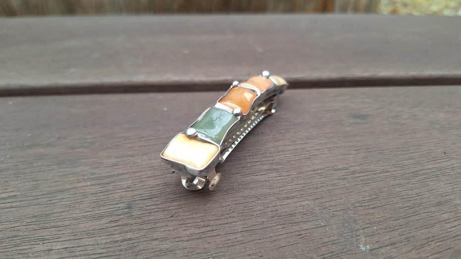 Klamra do włosów, wykonana z miedzi, cyny i agatów. Wymiary ok. 8 na 1.3 cm. Zapięcie 6 cm, metalowe.