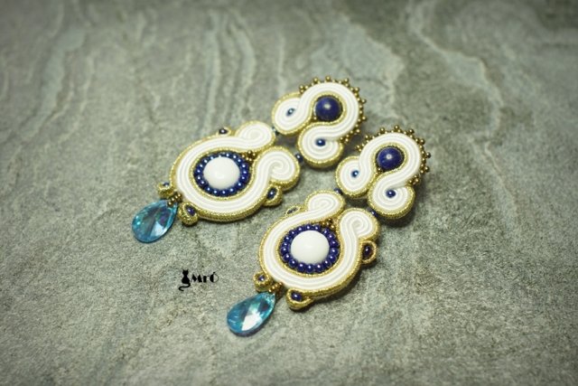 Eleganckie kolczyki wykonane motodą haftu soutache. Do wyrobu użyłam koralików preciosa, białych jadeitów, kulek lapis lazuli oraz kryształków Sowarovskiego ( 16 mm) w kolorze Aquamarine AB. Długość kolczyków to 8,5 cm. Mocowane za pomocą sztyftow. Kolczyki wykończone są białym filcem. Dwustronnie zaimpregnowane.