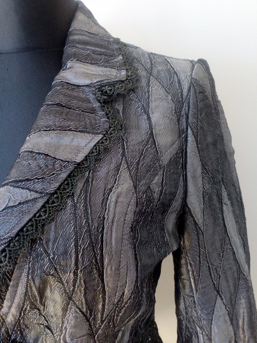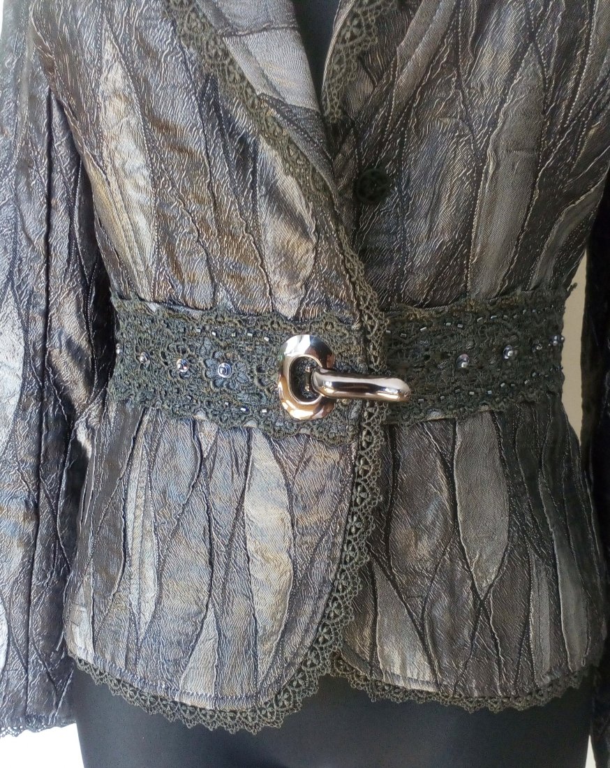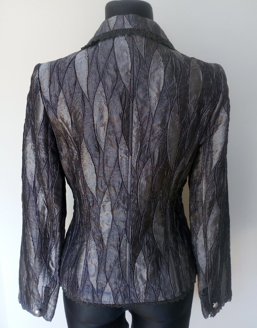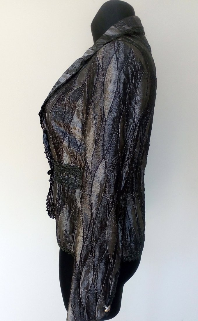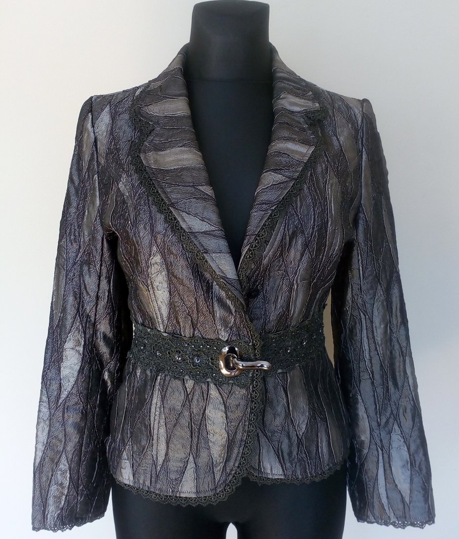 Bardzo elegancki żakiet w kolorach jasnym i ciemniejszym stalowym, materiał z połyskiem i z fakturą, cały żakiet obszyty ażurową koronką w grafitowym kolorze, z przodu na wysokości pasa naszyta szeroka koronka, zdobiona delikatnie makaronikami, koralikami i cekinami - wszystko w tonacji grafitu, żakiet zapinany na ładną, chromowaną klamrę i jeden zatrzask od środka materiał żakietu miękki, podatny, całość bez podszewki