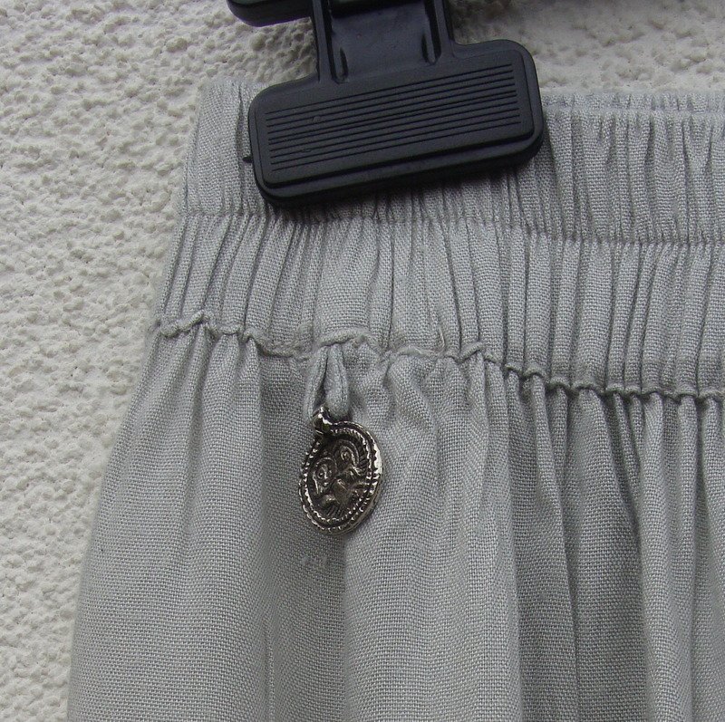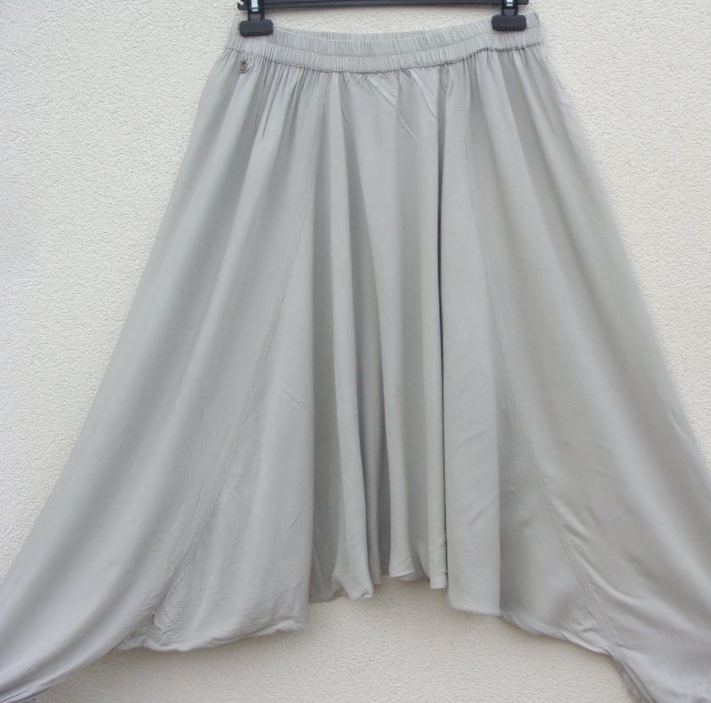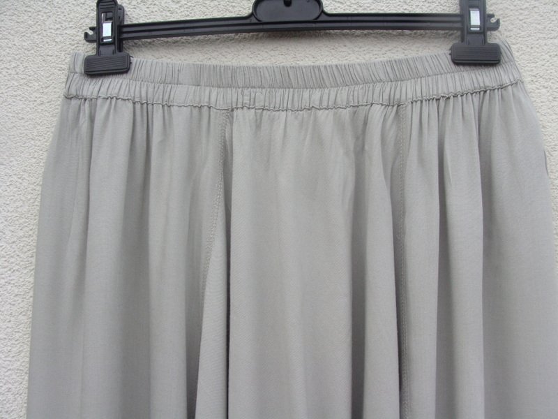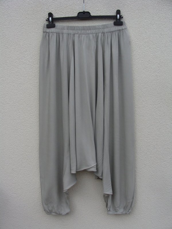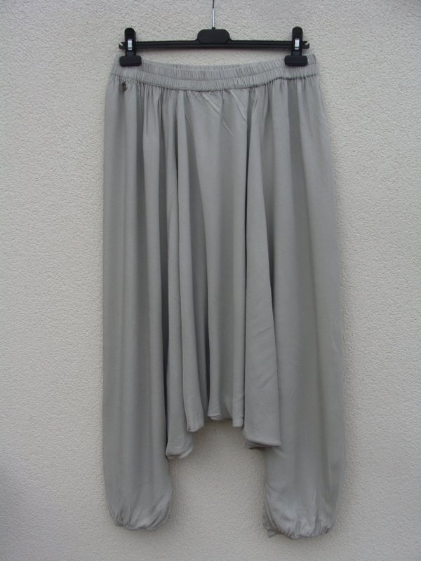 Luźne spodnie typu alladynki lub pumpy z przewiewnej tkaniny wiskozowej w pistacjowo-miętowym kolorze. Na wszywanej mocnej gumie w pasie, w dole nogawek wciągnięte gumki.