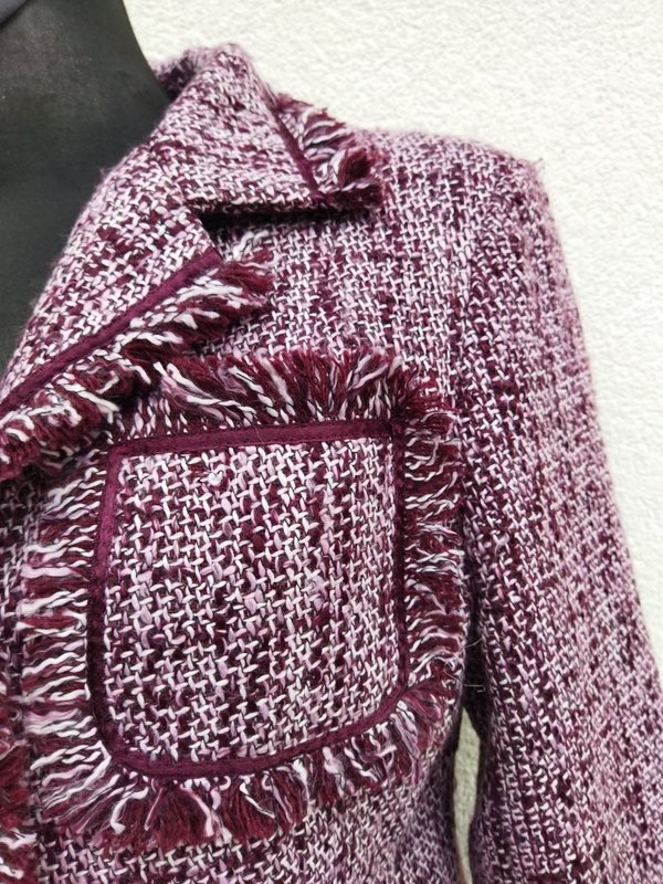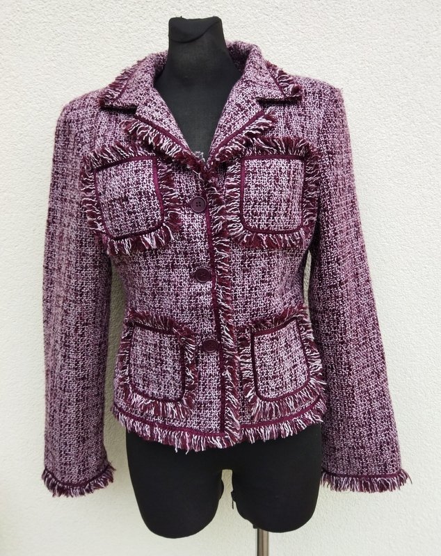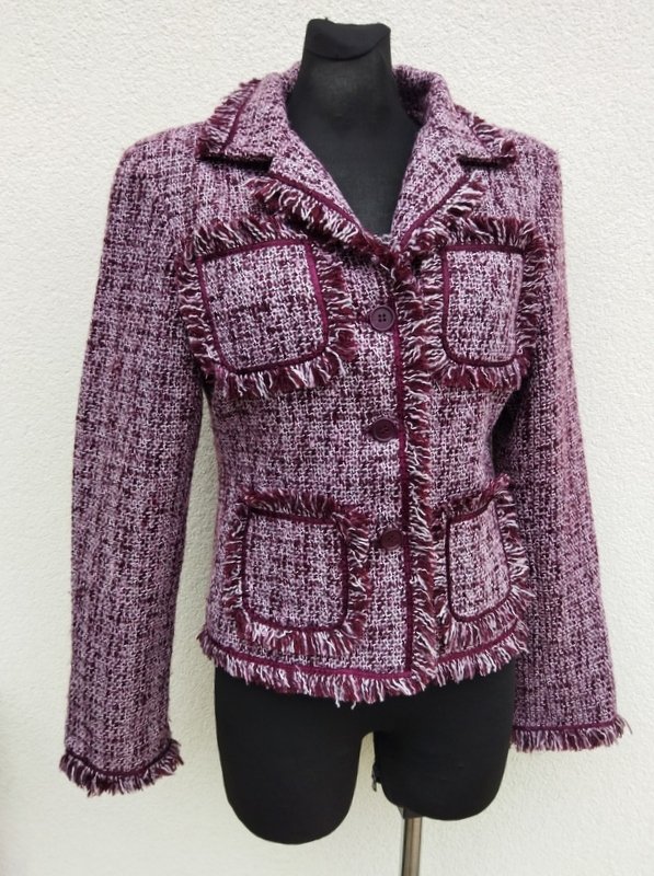 Ciekawa marynarka z fakturą przeplatanki w melanżowym oberżynowym kolorze z bielą i wrzosem. Taliowana, z kołnierzem z rewersami, z czterema naszywanymi kieszonkami, z rozcinanymi mankietami. Uroki dodają jej wykończenia frędzelkami wyciąganymi z tkaniny i naszywane tasiemki w oberżynowym kolorze. Zapinana na trzy guziki. całość na podszewce