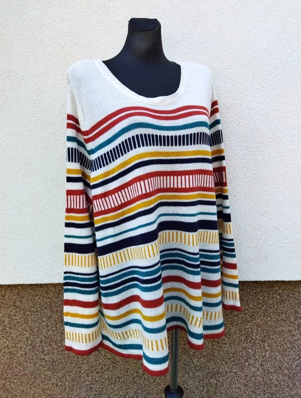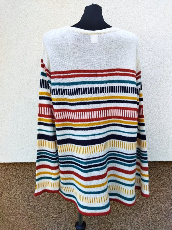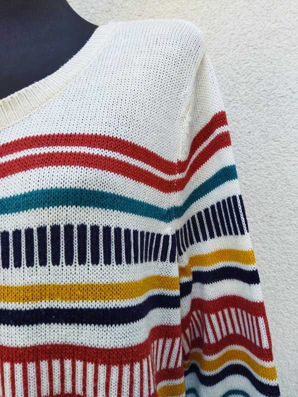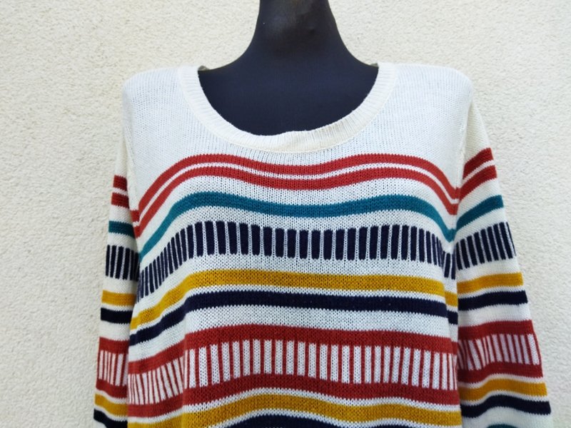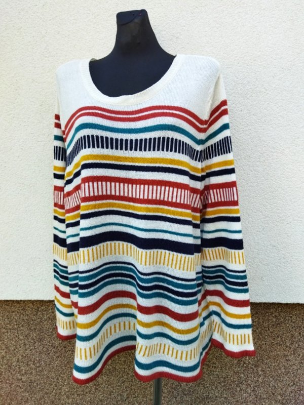 Przyjemny akrylowy sweter w kolorowe poziome i pionowe paski na tle mlecznej bieli. Minimalistyczny krój z owalnym dekoltem