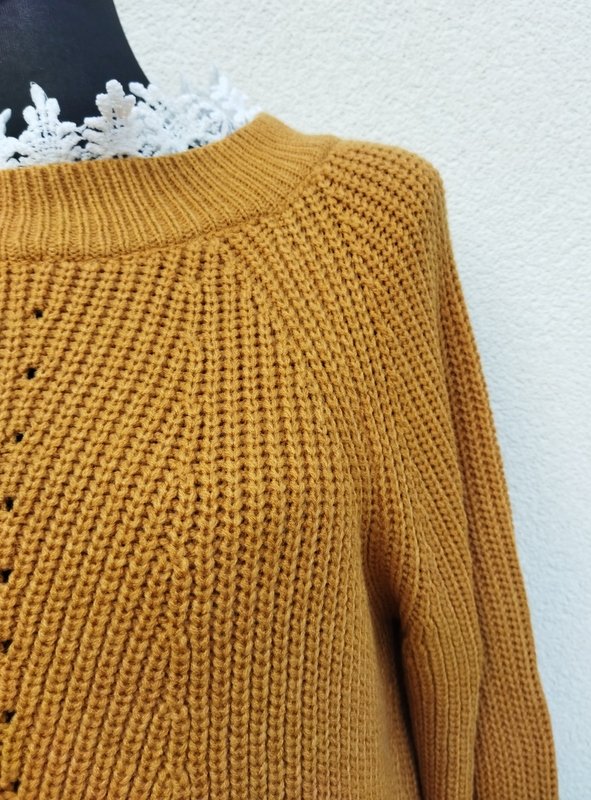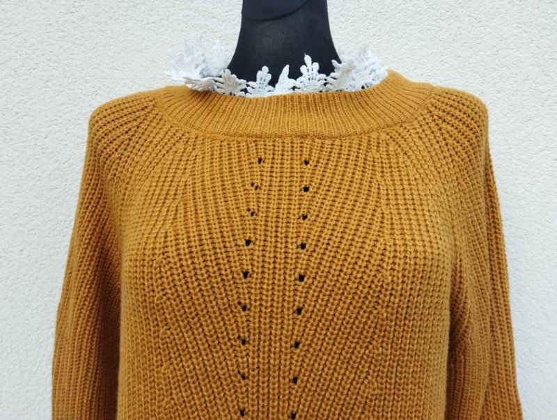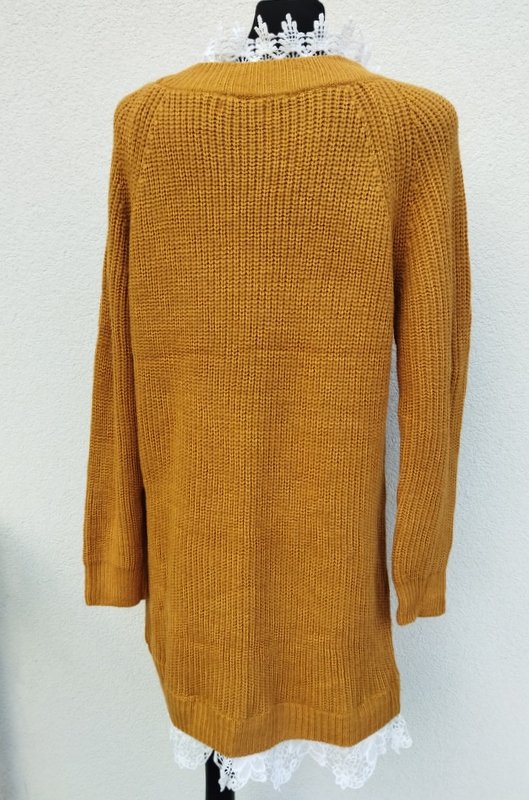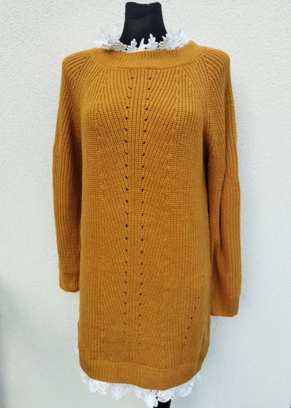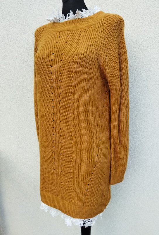 Dłuższy sweter lub sukienka z mięsistym angielskim ściegiem z akrylowej włóczki w miodowym kolorze, pod szyją i dołu doszyta biała koronka. miły podatny i rozciągliwy.