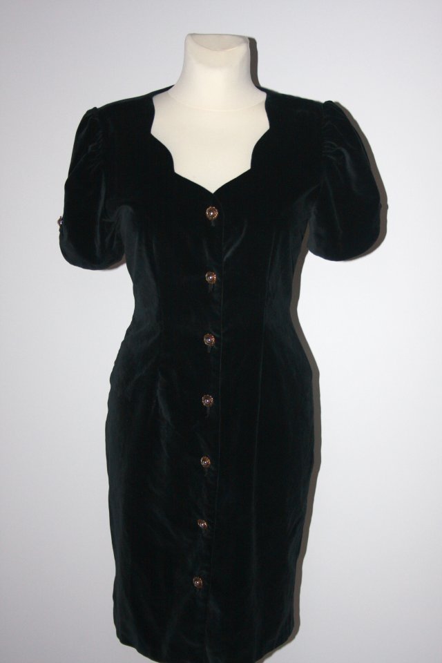 śliczna wyjściowa dopasowana aksamitna sukienka vintage w kolorze głębokiej czerni, zapinana z przodu po całości na ozdobne guziki w kolorze starego złota, krótki, bufiasty rękawek z rozcięciem i ozdobnym guzikiem