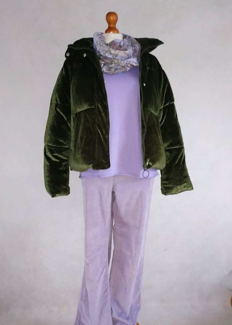 Można tworzyć ciekawe stylizacje z wieloma kolorami. Kurtka typu "puchówka" wypełniona poliestrem.