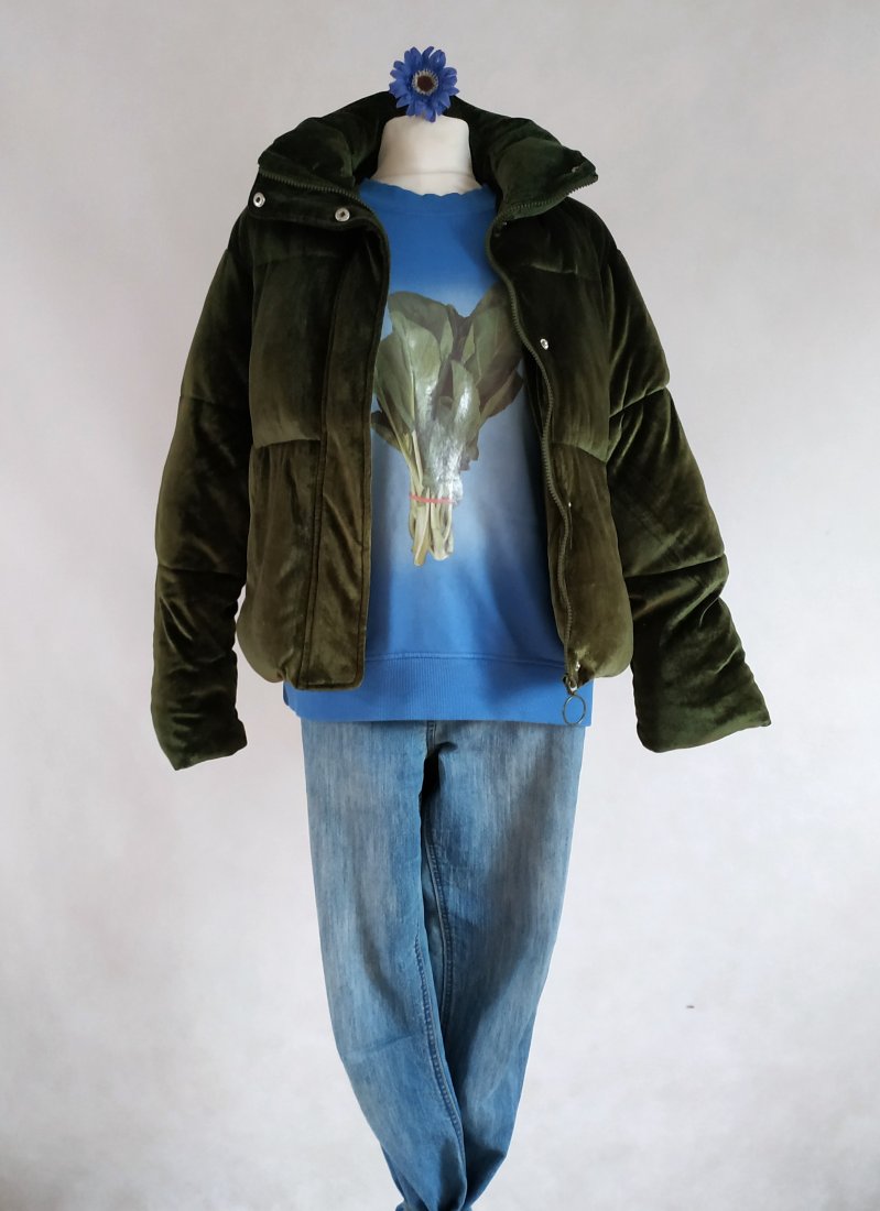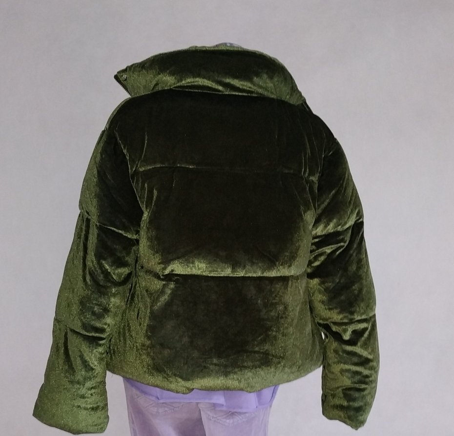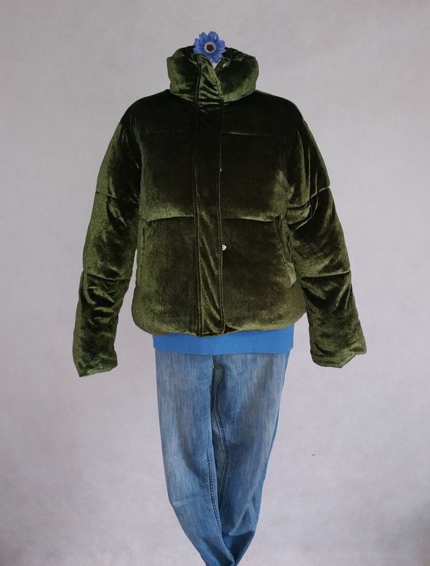 kolor oliwkowy, wzmocniony efektem, jaki daje welur/aksamit.zapinana na suwak oraz napy.dwie kieszenie na przodzie.Kołnierz - stójka wokół szyi.