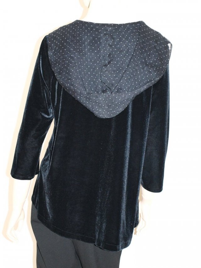 piękna czarna narzutka od szwedzkiej projektantki Marthy mildred. prosty fason, z cieniutkim kapturem w biały maczek. rękaw 3/4. bez podszewki, materiał aksamitny 100% poliester. stan bardzo dobry. rozmiar z metki Xl. myślę, że dobra także dla 40. na manekinie o rozmiarze 38.