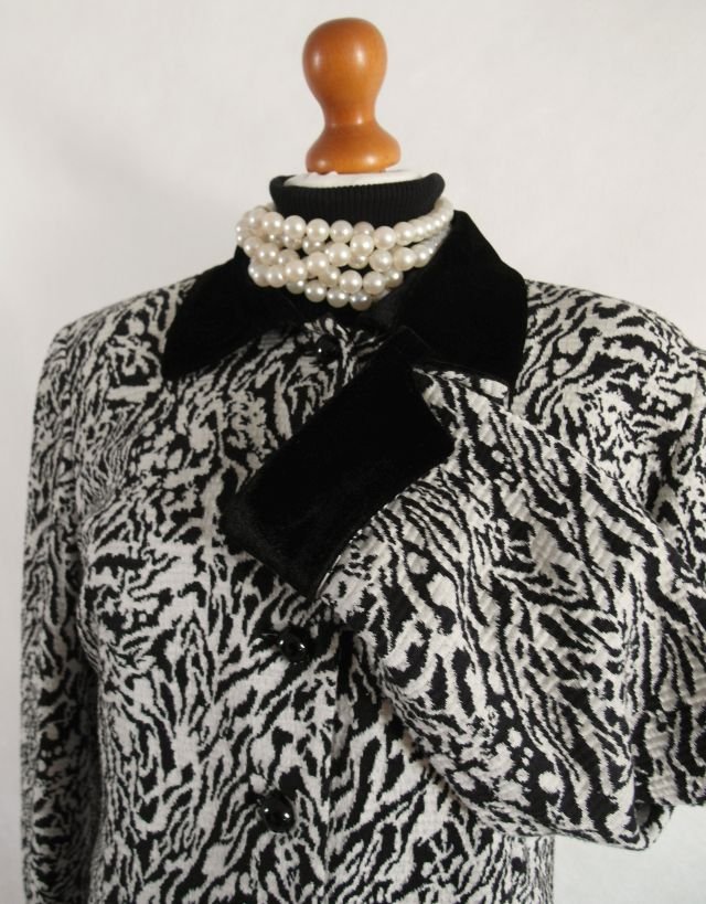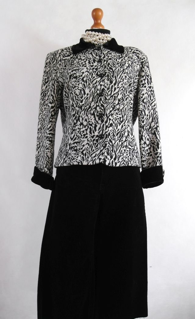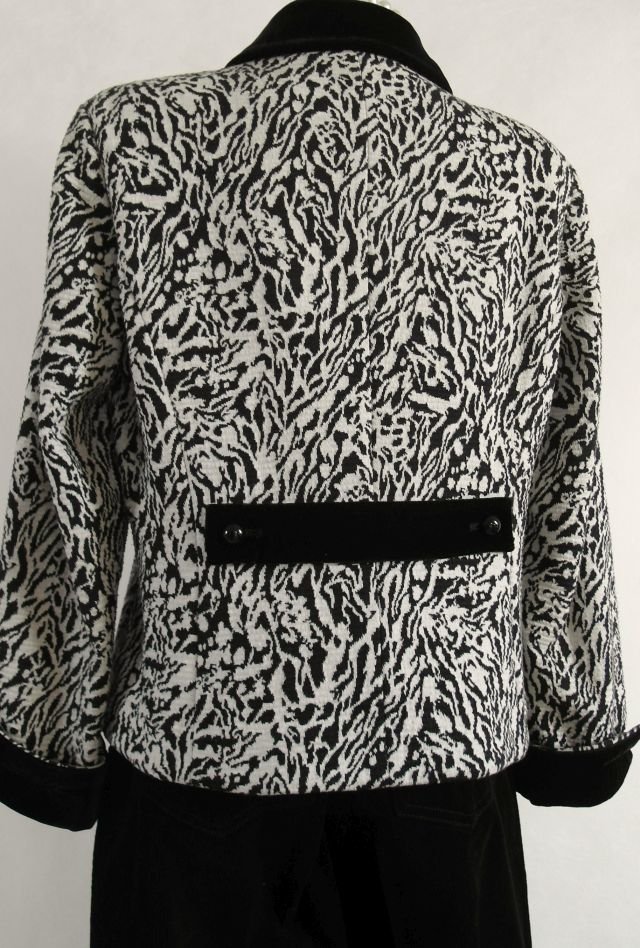cienka dopasowująca się dzianina.kolor bardzo jasny beż i czarny. kołnierzyk, mankiety, patka z tyłu oraz wewnętrzne wykończenie połów wykonane z aksamitu. Marynarka ma cienkie poduszeczki na ramionach, zapinana na czarne błyszczące guziki kuleczki.Bardzo wygodna,klasyczna.
