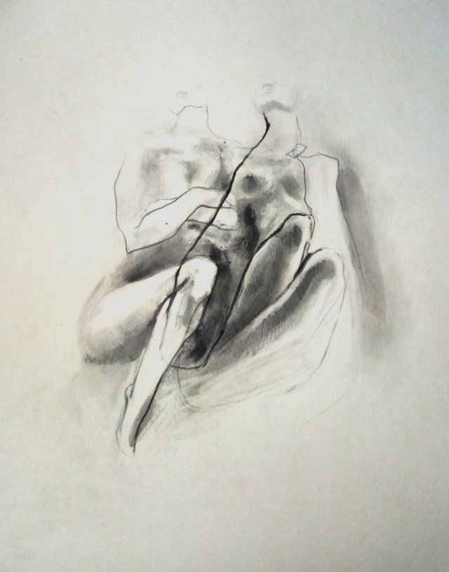 Rysunek w technice węgla i ołówka na ciepłej bieli brystolu kredowego.