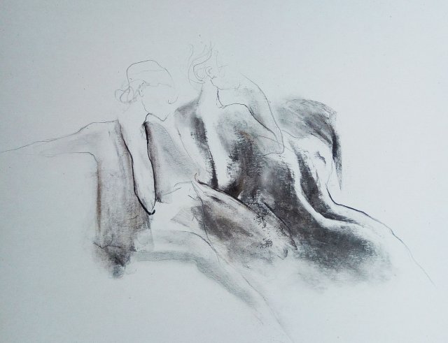 Rysunek w technice węgla i ołówka na brystolu kredowym w tonacji ciepłej bieli.Format obrazka 30x40cm.
