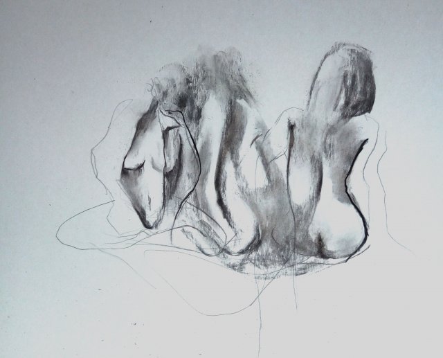 Rysunek w technice węgla i ołówka na brystolu kredowym w tonacji ciepłej bieli.Format obrazka 30x40cm.