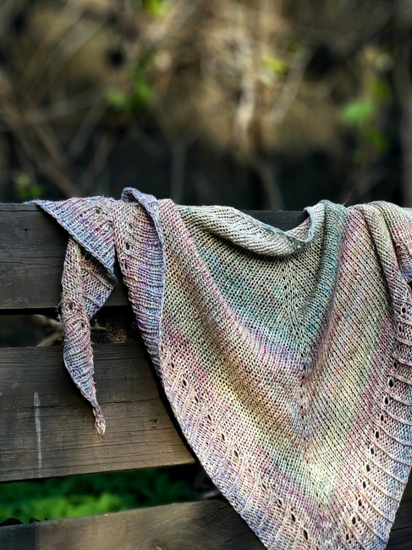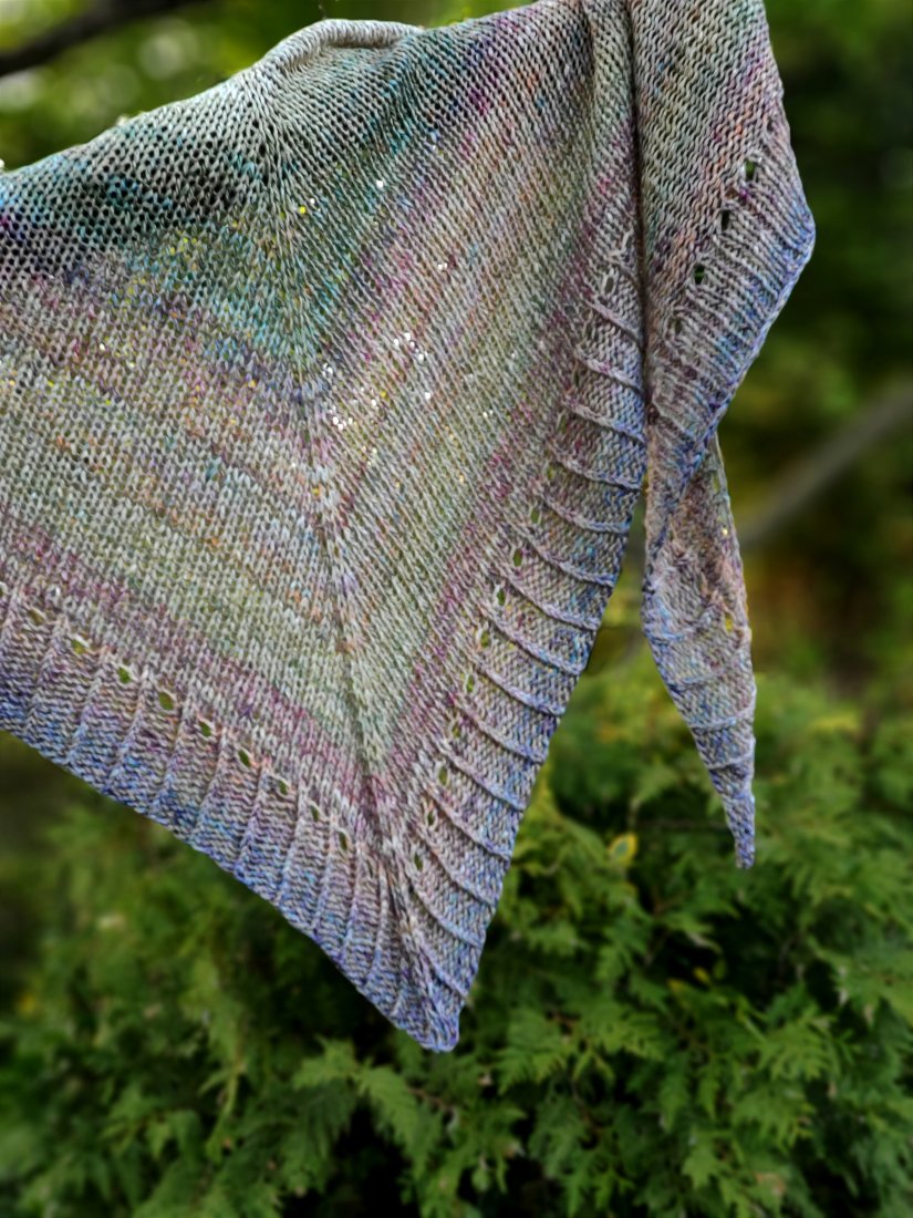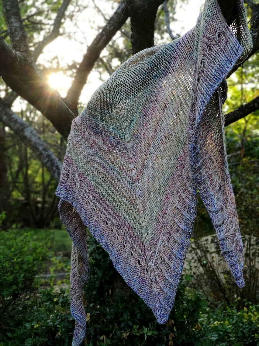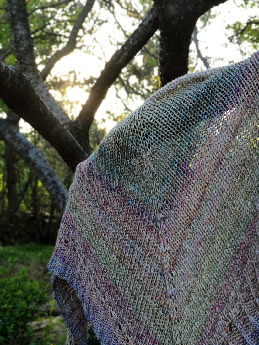 Chusta wykonana ręcznie na drutach z włoskich włóczek, jedna- to połączenie bawełny, lnu i wiskozy o delikatnej kolorystyce, druga jest mieszanką cudownie miękką - to jedwab z delikatną wełną wielbłądzią ( 50/50%). Razem dały piękną lejącą dzianinę, która otuli nas w chłodne letnie poranki i wieczory, a także osłoni nasze ramiona w potrzebie- przed upalnym słońcem.