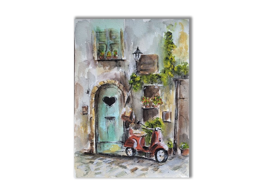 Uroczy akwarelowy obraz na białym, wysokogatunkowym 300g papierze przedstawiający klimatyczną, włoską uliczkę z charakterystycznymi drzwiami w kształcie serca i stylowym, czerwonym skuterem.