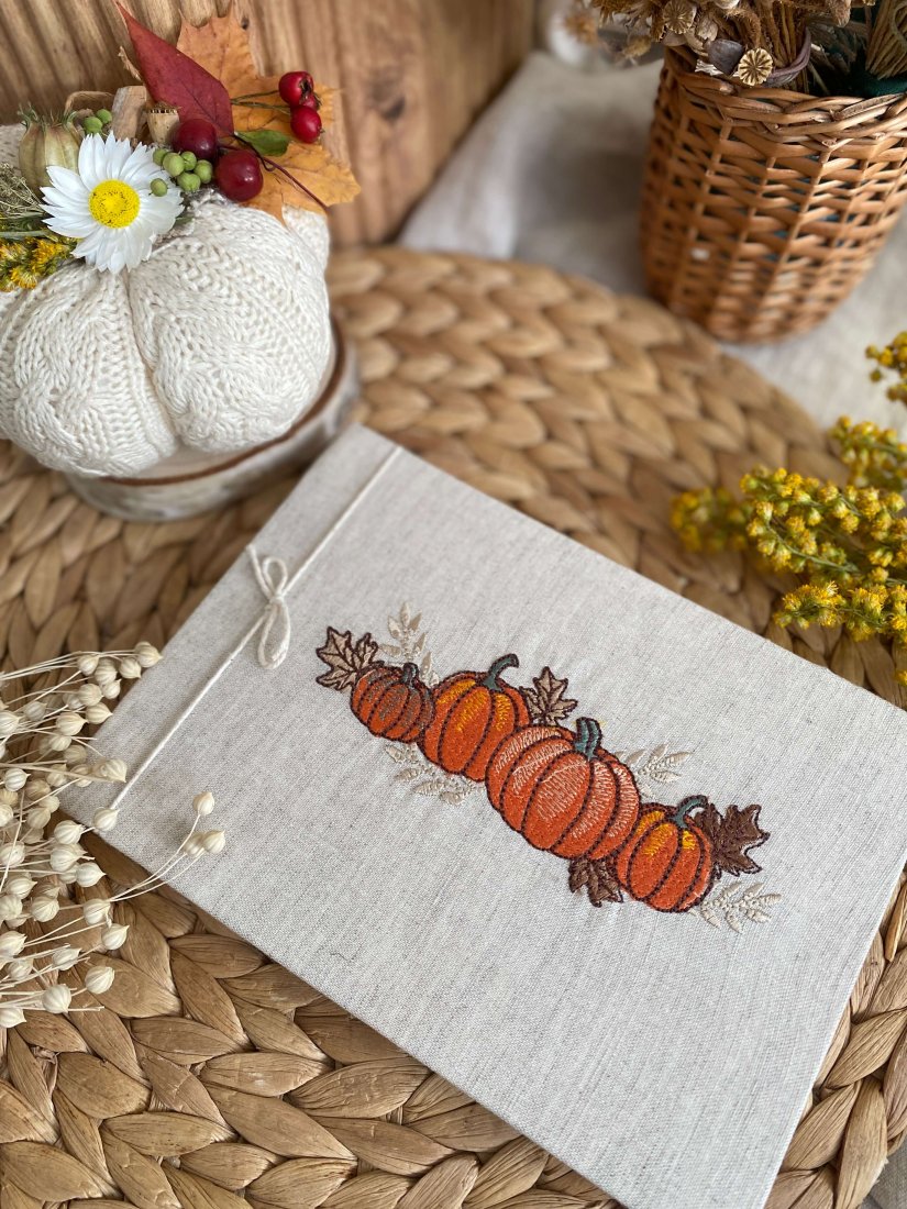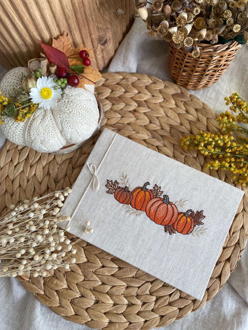 Wyjątkowy, mały album poziomy o naturalnym charakterze – idealny do przechowywania najpiękniejszych wspomnień. Okładka została uszyta z lnu i ozdobiona haftem przedstawiającym jesienną kompozycję z dynią i kwiatami, dzięki czemu album staje się nie tylko praktyczny, ale także dekoracyjny
