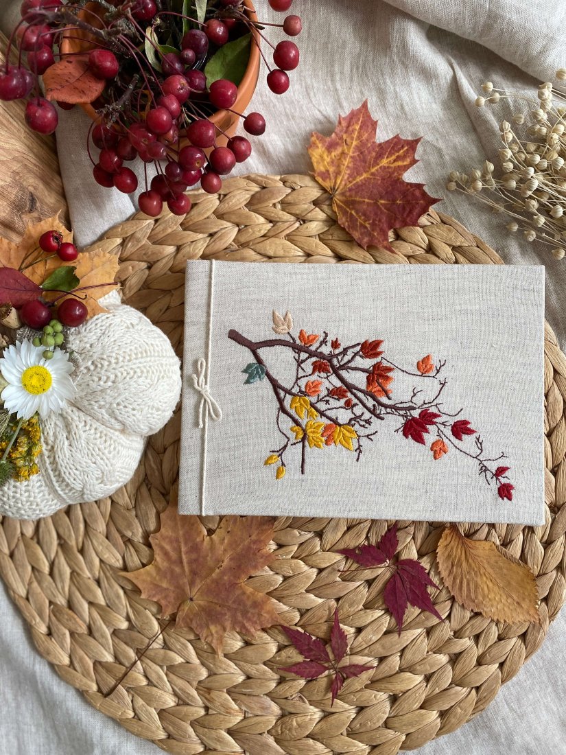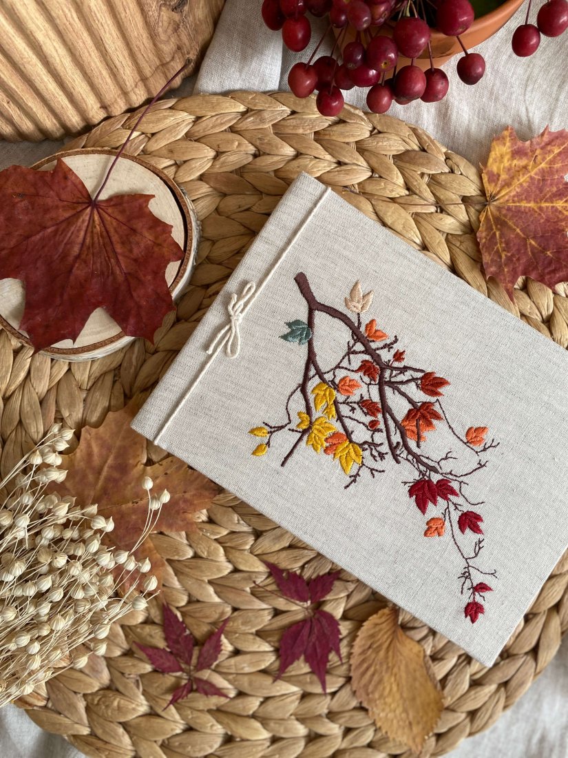 Wyjątkowy, mały album poziomy o naturalnym charakterze – idealny do przechowywania najpiękniejszych wspomnień. Okładka została uszyta z lnu i ozdobiona haftem przedstawiającym jesienną kompozycję z dynią i kwiatami, dzięki czemu album staje się nie tylko praktyczny, ale także dekoracyjny