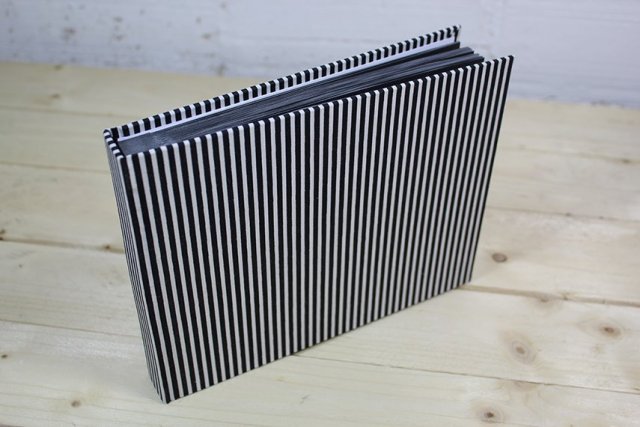 Album obleczony bawełnianym materiałem w białe i czarne pasy. Zawiera 20 sztywnych kart z papieru Fabriano o gramaturze 280 g/m2, kolor czarny. Jest to najwyższej jakości bezkwasowy papier, bezpieczny dla fotografii. Czarne karty przedzielone są przekładkami z kalki kreślarskiej o gramaturze 65 g/m2. Czerń doskonale podkreśla charakter zdjęć, zaś mleczne przekładki nadają efekt tajemnicy. Karty zostały ręcznie zszyte na taśmę bawełnianą, która zapewni trwałość konstrukcji albumu na wiele lat. Na pierwszej z nich istnieje MOŻLIWOŚĆ nałożenia metodą przedruku DOWOLNEGO TEKSTU.