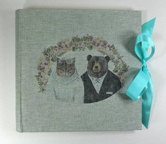 Album obleczony jest laminowanym płótnem lnianym o biało-błękitnym odcieniu. Na okładzinie znajduje się odbitka autorskiej ilustracji - jest to reprodukcja rysunku ołówkiem projektantki "TIRI-RIRI". Grafika jest romantyczna i dowcipna zarazem. Niebanalna i oryginalna dekoracja, pełna drobiazgowych szczegółów. ISTNIEJE MOŻLIWOŚĆ DOBORU ZWIERZĄT NA ILUSTRACJI.