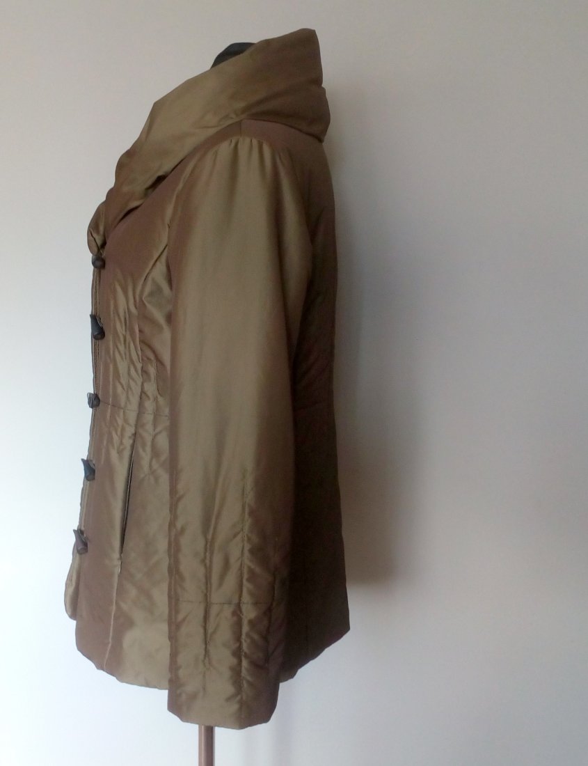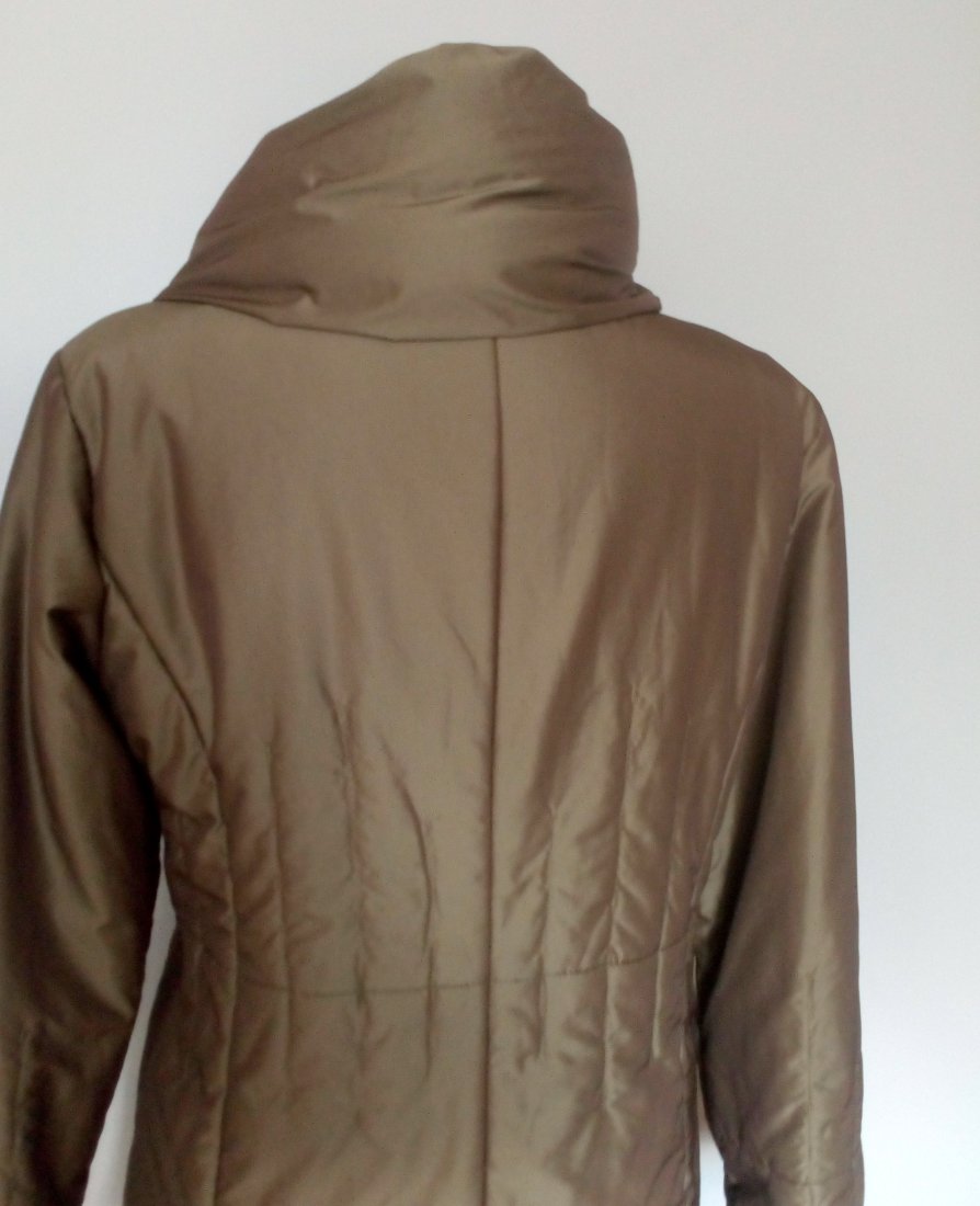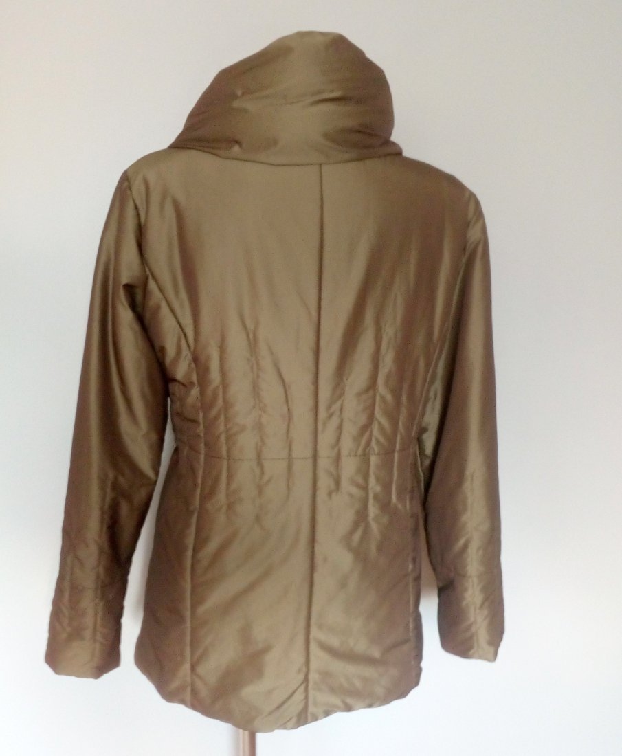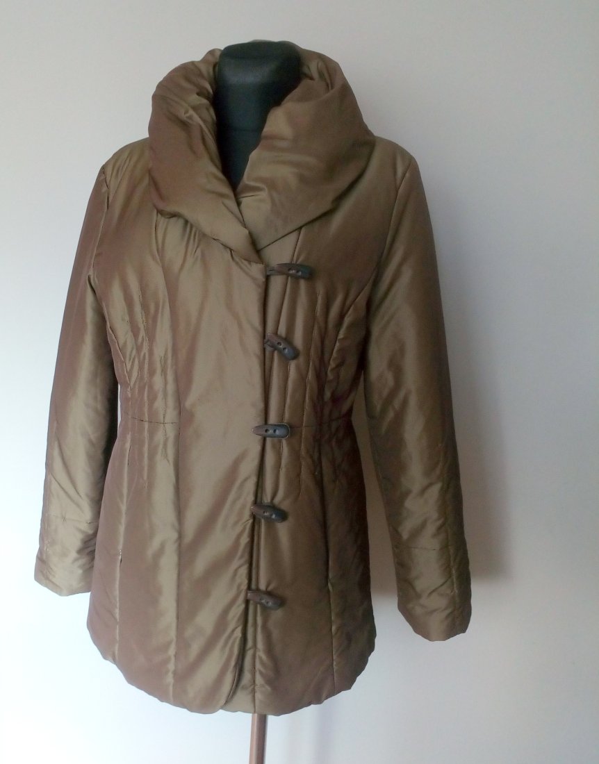Wygodna, ciepła kurtka w kolorze oliwkowym, zapinana na zamek kryty listwą, listwa z zapięciem na rogowe guziki i pętelki, w szwach z przodu pionowo wpuszczane kieszenie z zamkami