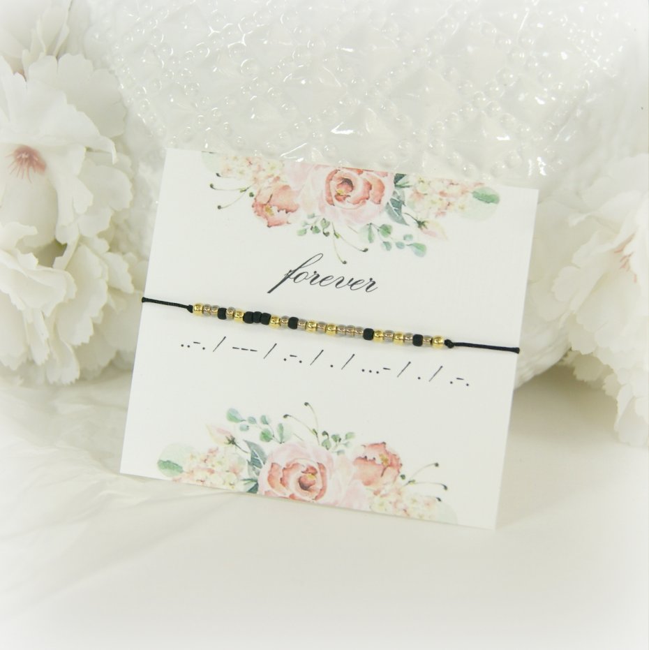Jest to wyjątkowa bransoletka, pozornie przypadkowy ciąg koralików układa się w słowo "forever" zakodowane w alfabecie morsa.