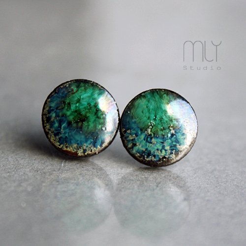 Ceramiczne okrągłe kolczyki w formie sztyftów, ręcznie wykonane z delikatnej czekoladowobrązowej gliny kamionkowej, jednostronnie szkliwione mieszanką błękitnych i zielonych szkliw z efektem plamek, na sztyftach w kolorze srebrnym. Średnica ok. 11mm. Polecam