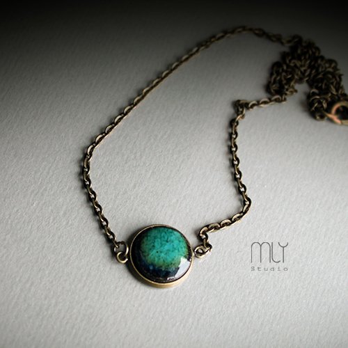 Okrągły ceramiczny wisior, ręcznie wykonany z mocno spieczonej gliny kamionkowej, szkliwiony efektowną mieszanką błyszczących zielonych szkliw z efektem plamek, zawieszony na łańcuszku w kolorze starego złota. Średnica zawieszki ok. 1,4cm, długość łańcuszka 2x20cm. Polecam . Termin realizacji zamówienia to 1-2 dni