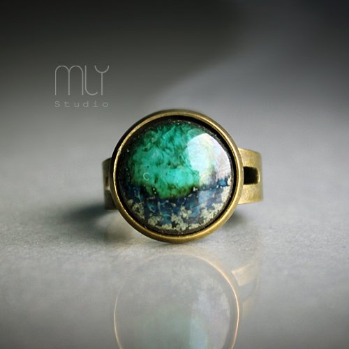 Efektowny pierścień z ceramicznym oczkiem, ręcznie wykonanym z gliny kamionkowej, poszkliwionym mieszanką szarozielonych szkliw z efektem plamek. Obrączka regulowana w kolorze starego złota, średnica oczka ok 14mm. Polecam