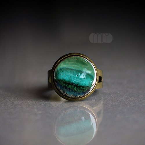 Efektowny pierścień z ceramicznym oczkiem, ręcznie wykonanym z gliny kamionkowej, poszkliwionym mieszanką szarozielonych szkliw z efektem plamek. Obrączka regulowana w kolorze starego złota, średnica oczka ok 14mm. Polecam