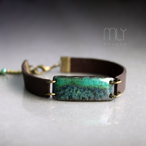 Efektowna bransoletka wykonana ze ekologicznego rzemienia jubilerskiego w kolorze brązowym, elementów w kolorze starego złota i ręcznie wykonanego ceramicznego elementu szkliwionego mieszanką zielonych szkliw z efektem plamek. Czas realizacji ok 5-6dni. Obwód regulowany. Polecam