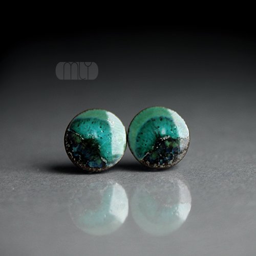 Ceramiczne okrągłe kolczyki w formie sztyftów, ręcznie wykonane z delikatnej czekoladowobrązowej gliny kamionkowej, jednostronnie szkliwione mieszanką zielonych szkliw z efektem plamek, na sztyftach w kolorze srebrnym. Średnica ok. 9mm. Polecam